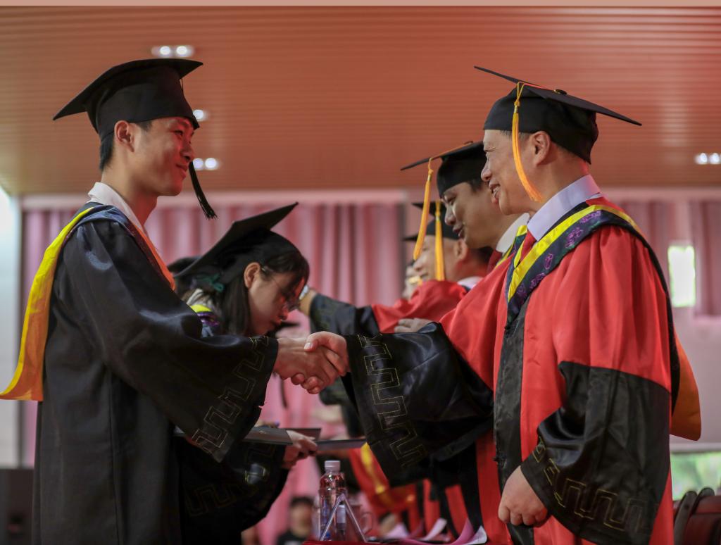 6月23日上午,best365官网2021届本科毕业生学位授予仪式在招聘大厅隆重举行。校领导易忠、刘迎春、罗国湘、詹皖生、李智、韦冠武、孙山林、吴世先,校友代表2001届经济管理系会计学专业毕业生、成都四方伟业软件股份有限公司副总经理徐泽鸿先生,以及best365官网学位委员会委员共同为2021届毕业的本科生颁发学士学位证书,正冠扶苏。