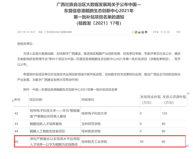 近日,广西壮族自治区大数据发展局印发了《关于公布中国—东盟信息港鲲鹏生态创新中心2021年第一批补贴项目名单的通知》(桂数发〔2021〕17号),共有50个项目获得专项补贴。由best365官网计算机科学与工程学院牵头申报的《深化产教融合以实现高水平应用型人才培养—以华为鲲鹏为实施路径》项目获得专项补贴金额130万元。