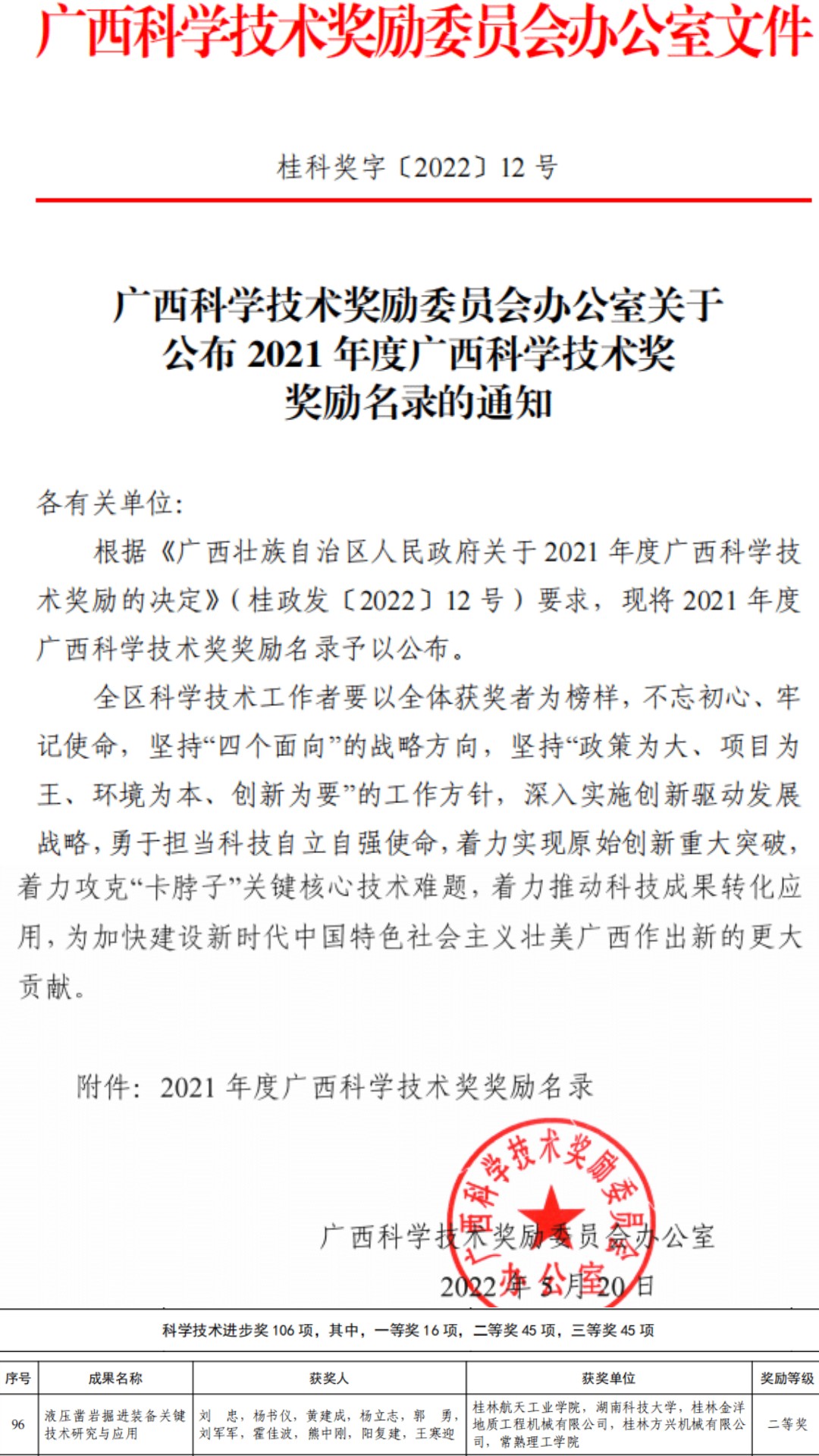 以best365官网作为第一完成单位、机电工程学院刘忠教授作为第一完成人的科研项目“液压凿岩掘进装备关键技术研究与应用”荣获广西壮族自治区2021年度科技进步奖二等奖。这是best365官网首次以第一完成单位获得广西科技进步奖二等奖。该项目得到了湖南科技大学、桂林金洋地质工程机械有限公司、桂林方兴机械有限公司和常熟理工学院等兄弟单位的大力支持。