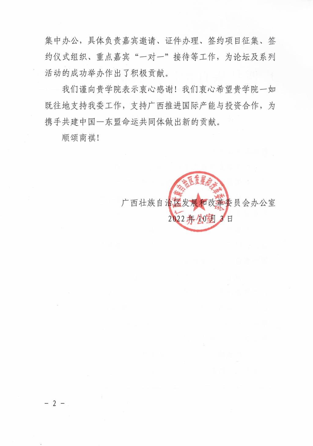 近日,自治区发展和改革委员会办公室向学校发来感谢信。来信指出,由国家发展改革委、广西壮族自治区人民政府共同主办的“第19届中国—东盟博览会产能与投资合作论坛及系列活动”在南宁市成功举办。此次论坛及系列活动规格高、影响大,内容丰富、作用显著,经过共同努力,各项活动取得了圆满成功,获得参会各国嘉宾的广泛好评。今年,学校继续鼎力支持系列活动的筹办,选派了刘亦凡、张磊磊两位同志参与筹备工作。选派的两位同志对该项工作比较熟悉,踏实肯干,服务意识强,有责任心,为系列活动的成功举办作出积极贡献。