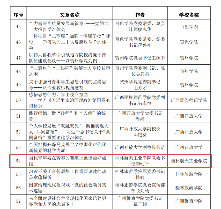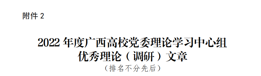 近日,由自治区党委教育工委组织开展的广西高校党委理论学习中心组优秀学习品牌和优秀理论(调研)文章推选活动评比结果揭晓。学校党委书记李幼平撰写的理论文章《当代青年要在青春的赛道上跑出最好成绩》入选广西高校党委理论学习中心组优秀理论(调研)文章。
