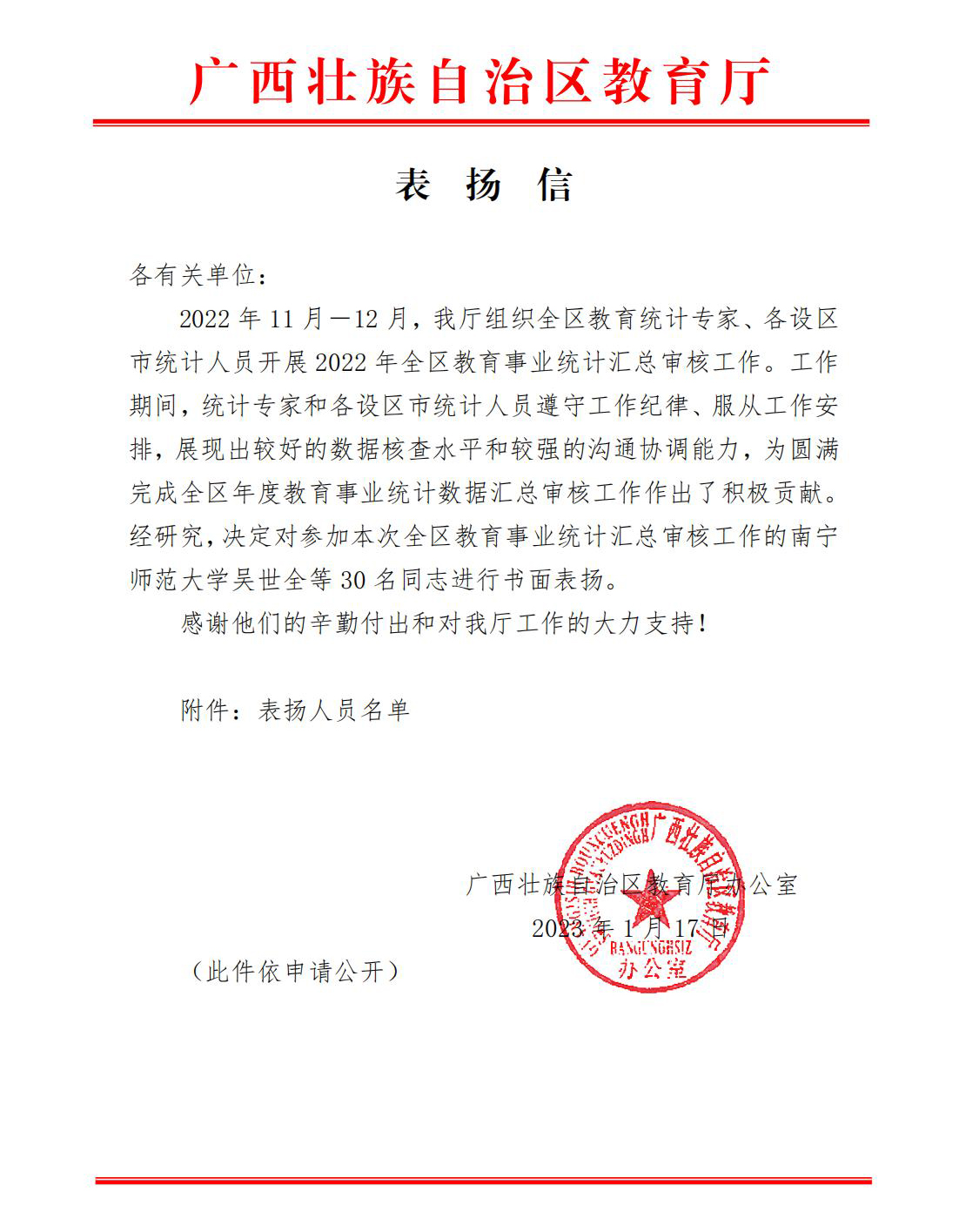 近日,自治区教育厅向best365官网发来表扬信,对在2022年全区教育事业统计数据汇总审核工作中表现优秀的30名同志进行通报表扬,best365官网教学质量监控与评估处张雪同志名列其中。