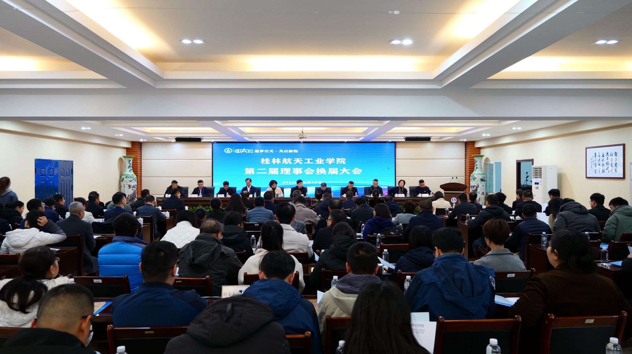 12月18日上午,学校第十届“航天日”重点活动best365手机版官方网站第二届理事会换届大会顺利举行。中国探月工程总设计师、中国科学院院士、国际宇航科学院院士、中国航天科技集团公司科技委副主任于登云;桂林市副市长郑平;中国航天科工集团有限公司第十研究院党委副书记、副院长濮秀君;中国航天科技集团有限公司第六研究院政工部部长张奎好;桂林航天电子有限公司党委书记龙送军;桂林电子科技大学党委副书记陈贵英;北华航天工业学院党委常委、副校长刘景旺;中国航天科工集团有限公司第九研究院人力资源部副部长张建国;学校校友、桂林光隆科技集团股份有限公司董事长彭晖出席会议。地方政府、合作企业、航天单位、科研院所、兄弟高校的各位领导,以及航天专家、学校领导、校友代表、学校相关职能部门负责人、师生代表参加会议。大会由校长吴尽昭主持。