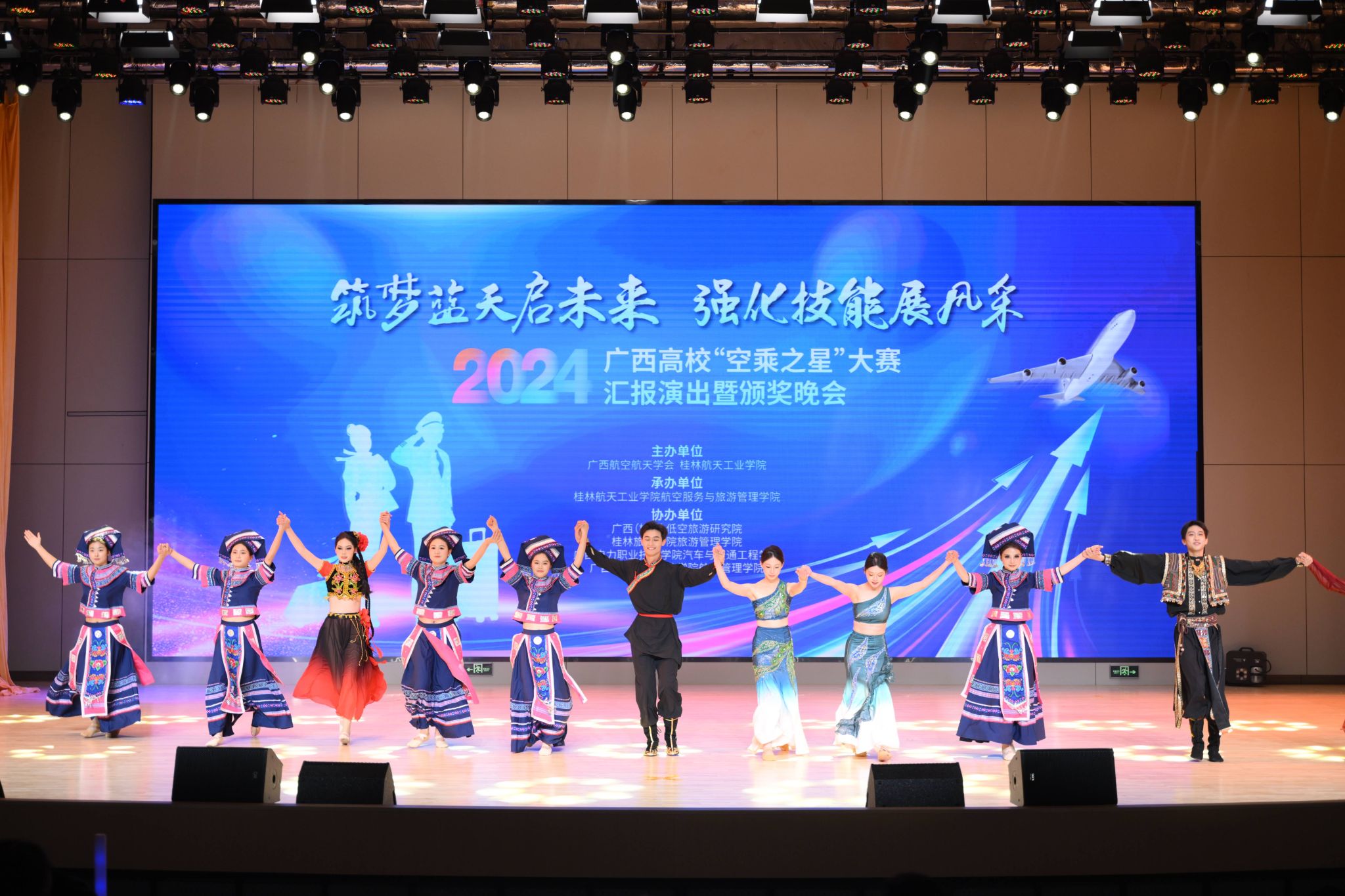 晚会以“筑梦蓝天启未来,强化技能展风采”为主题,共分为“鉴往知来·筑梦蓝天”、“青春相聚·逐梦蓝天”和“未来可期·圆梦蓝天”三个篇章,通过一系列精彩纷呈的表演,展现了广西高校航空服务类专业学子们的专业技能和艺术风采。其中,节目《族舞绮梦》由best365官网与桂林航空有限公司首批订单式培养学生表演,生动展现了校企合作的优良教学成果。