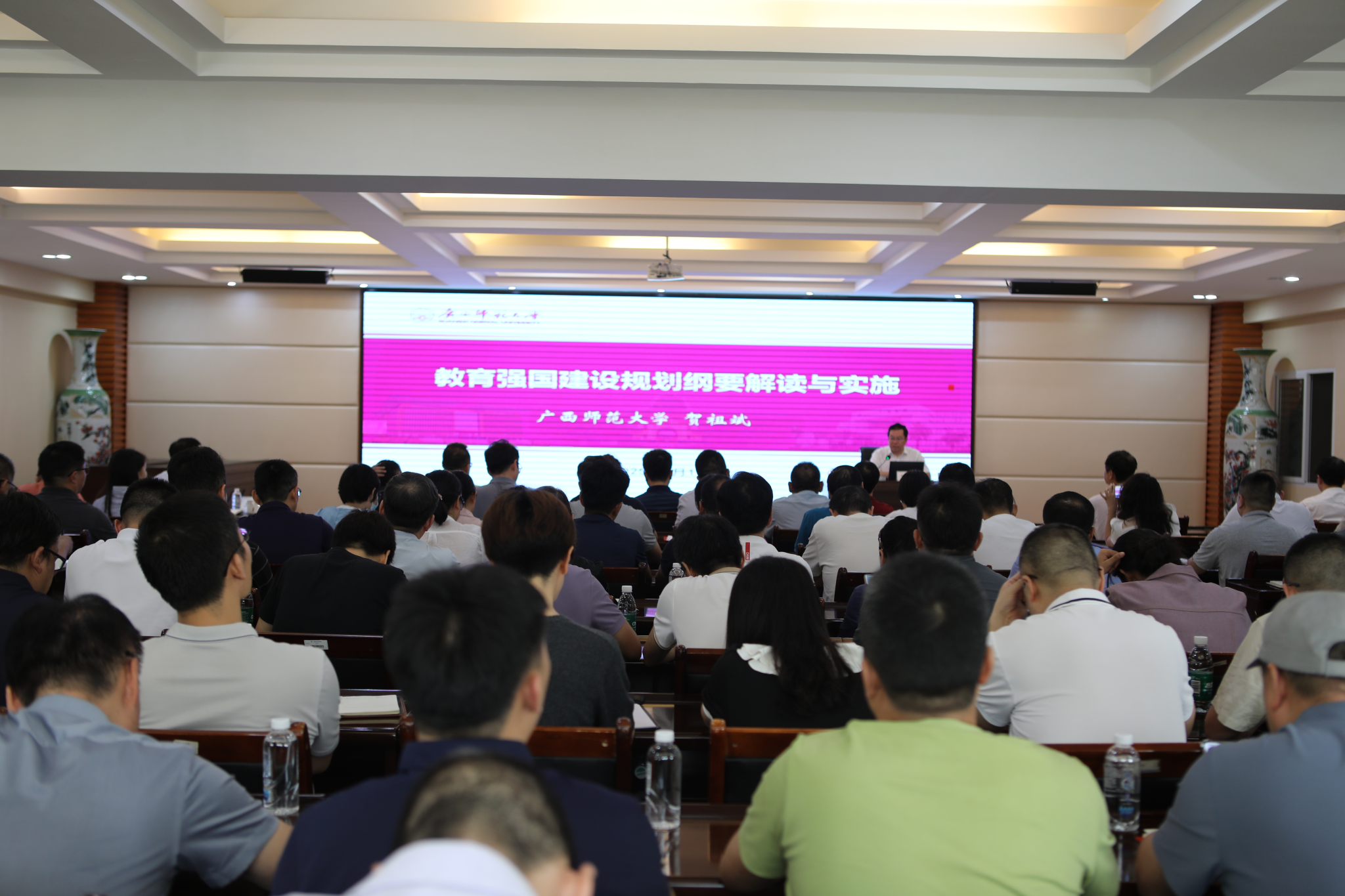 开班后,广西师范大学党委书记贺祖斌作《教育强国建设规划纲要解读与实施》的专题辅导。他紧密围绕习近平总书记2024年9月9日在全国教育大会上的重要讲话精神,从教育强国建设规划纲要出台的背景意义、编制的主要思路、总体目标、结构和主要内容以及全文,进行专业解读。聚焦“自强卓越的高等教育体系:不变与变”“龙头引领:十大关键词”两个方面,分析了教育强国建设规划纲要的实施举措,并通过人口预测模型,深入研究中国“少子化”现状对高等教育的影响及应对策略。