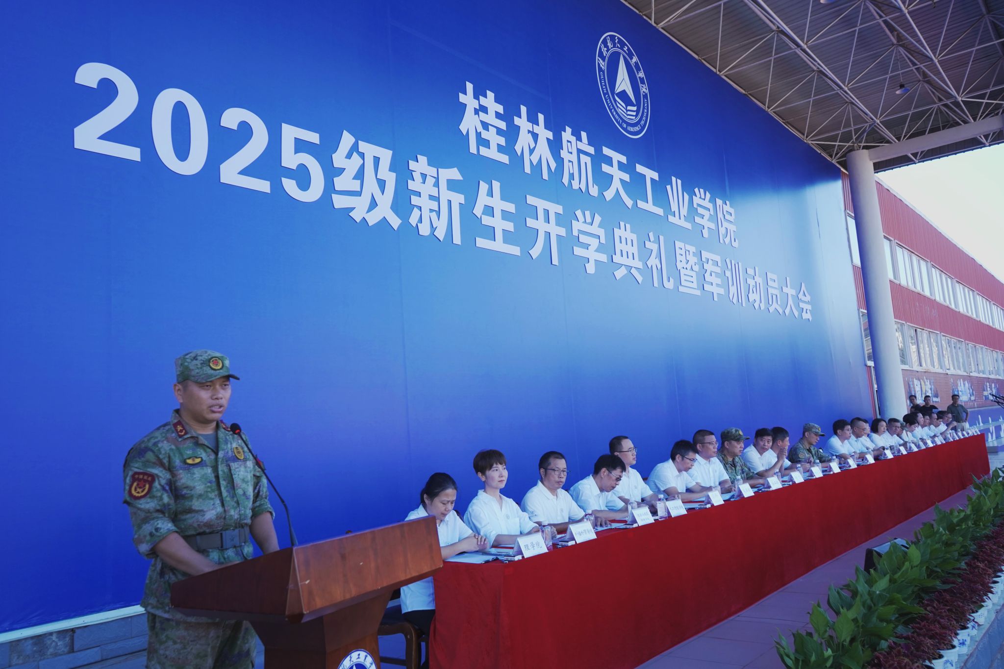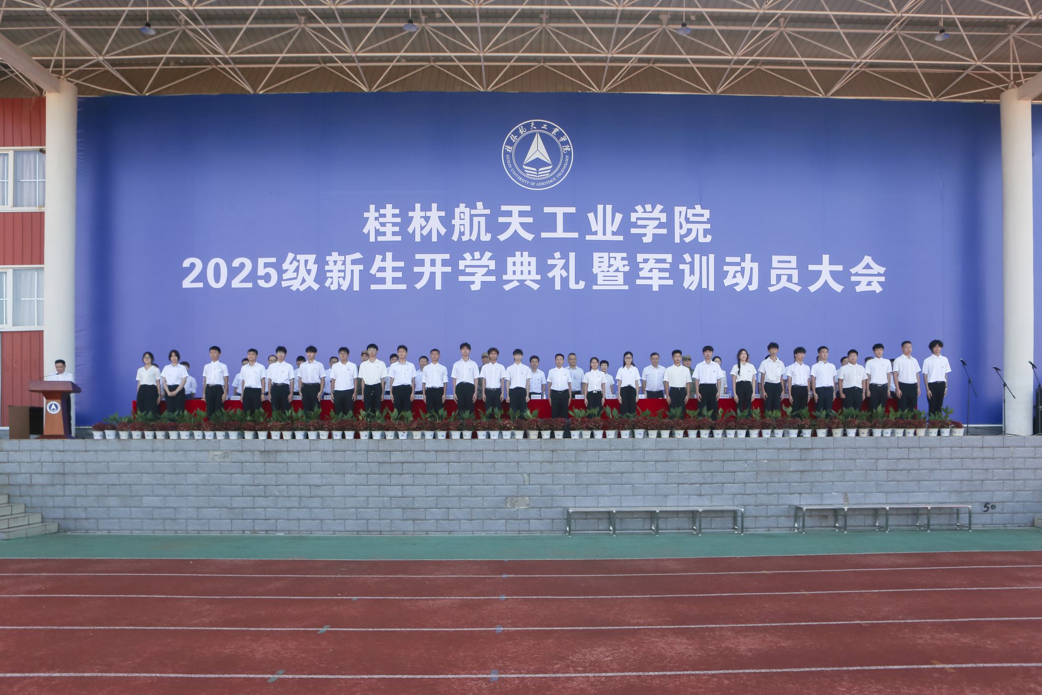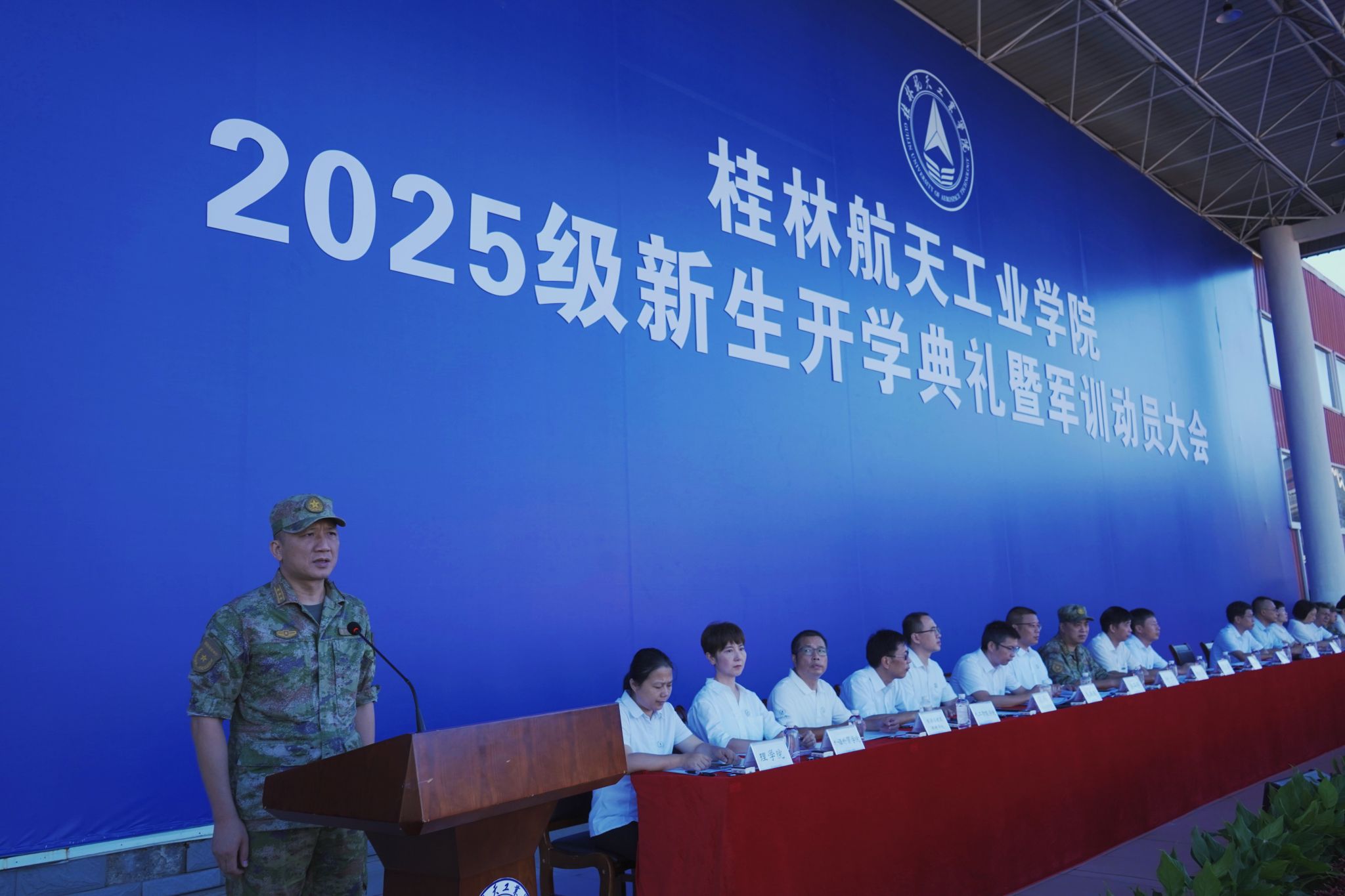 9月17日,best365官网2025级新生开学典礼暨军训动员大会在南校田径场举行。学校领导韩峻峰、吴尽昭、吴江萍、孙山林、葛莉、张立国、柯君行、杨永昌,军方代表桂林警备区战备建设处上校处长黄河森、七星区人民武装部上校部长周亮、七星区人民武装部上校政委刘广,校友代表胡晓洪女士出席开学活动,学工部(处)、教务处、武装部主要负责人,各学院负责人,2025级新生辅导员,全体新生及家长代表参加活动。典礼由校党委副书记孙山林主持。
