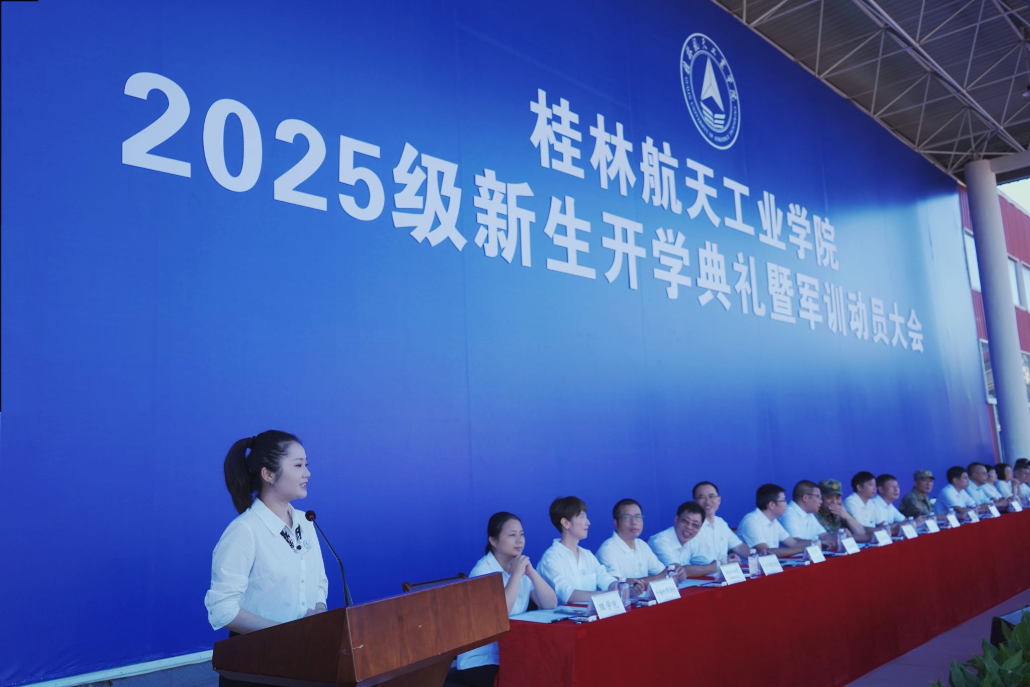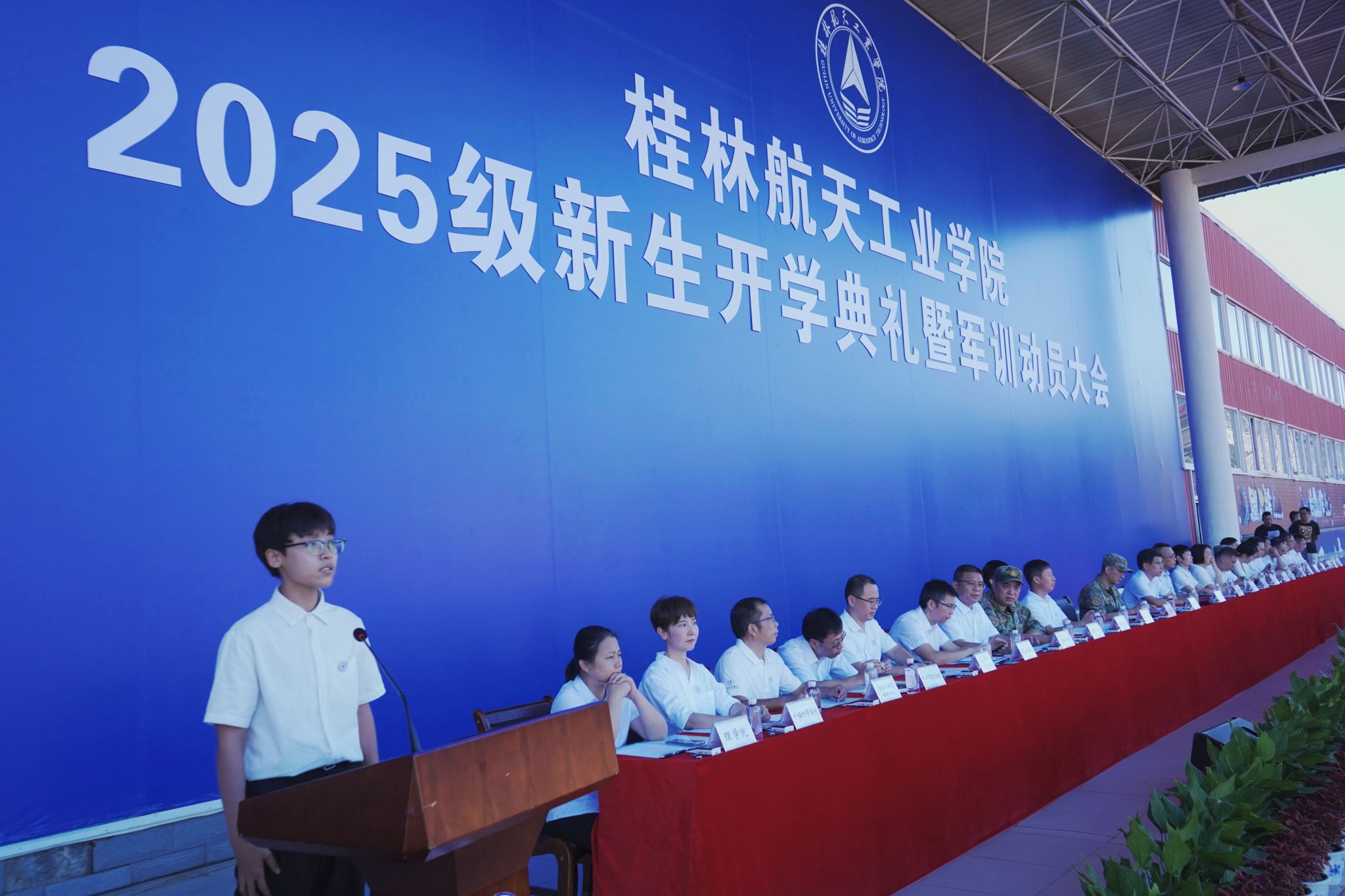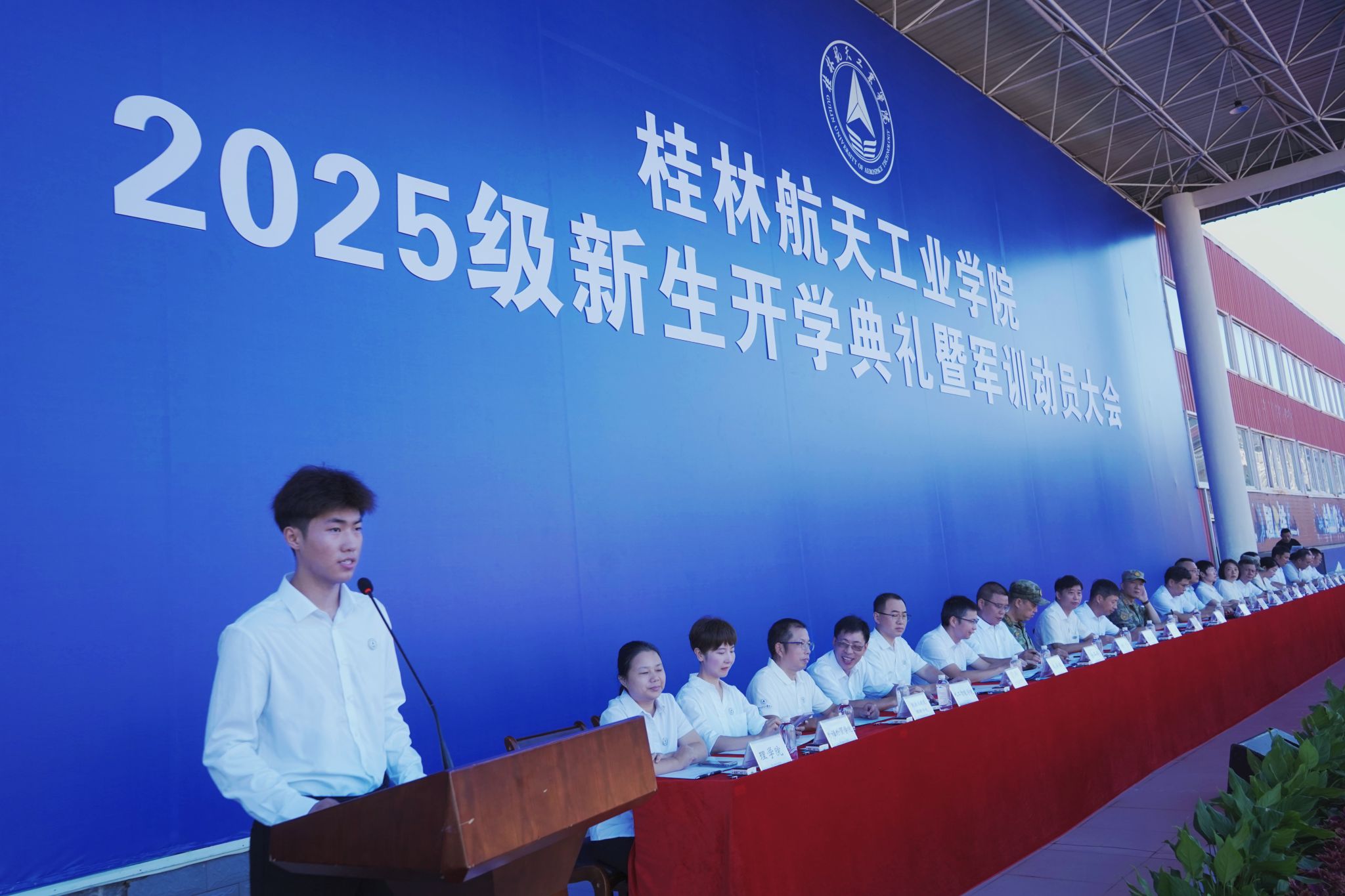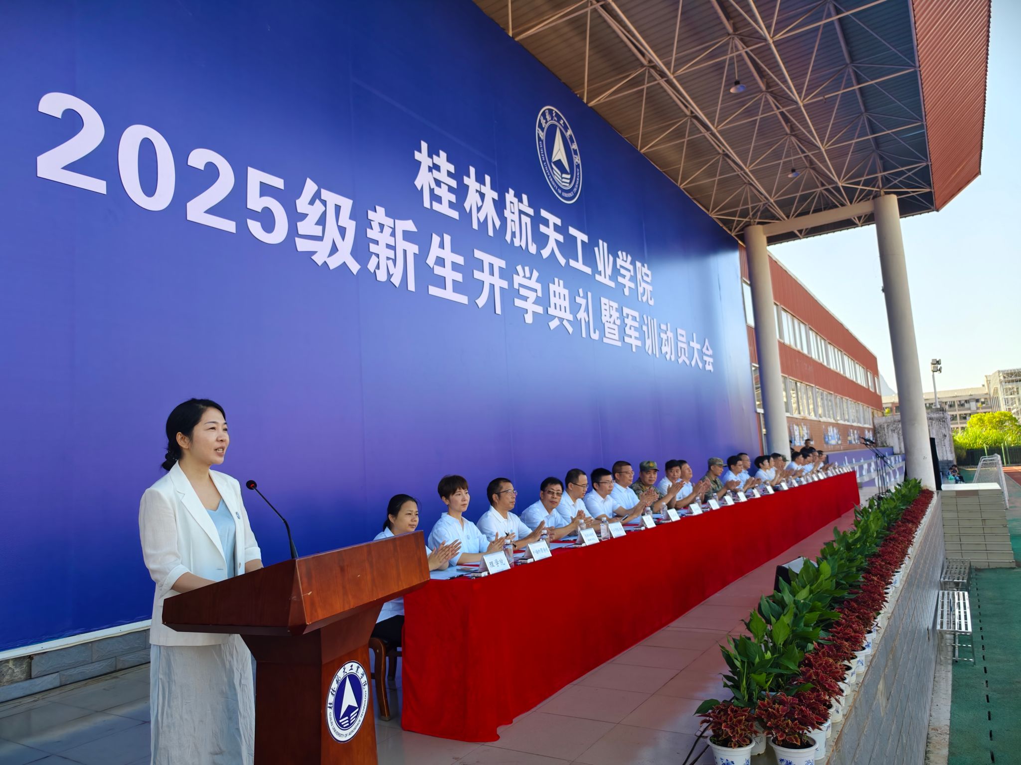 9月17日,best365官网2025级新生开学典礼暨军训动员大会在南校田径场举行。学校领导韩峻峰、吴尽昭、吴江萍、孙山林、葛莉、张立国、柯君行、杨永昌,军方代表桂林警备区战备建设处上校处长黄河森、七星区人民武装部上校部长周亮、七星区人民武装部上校政委刘广,校友代表胡晓洪女士出席开学活动,学工部(处)、教务处、武装部主要负责人,各学院负责人,2025级新生辅导员,全体新生及家长代表参加活动。典礼由校党委副书记孙山林主持。