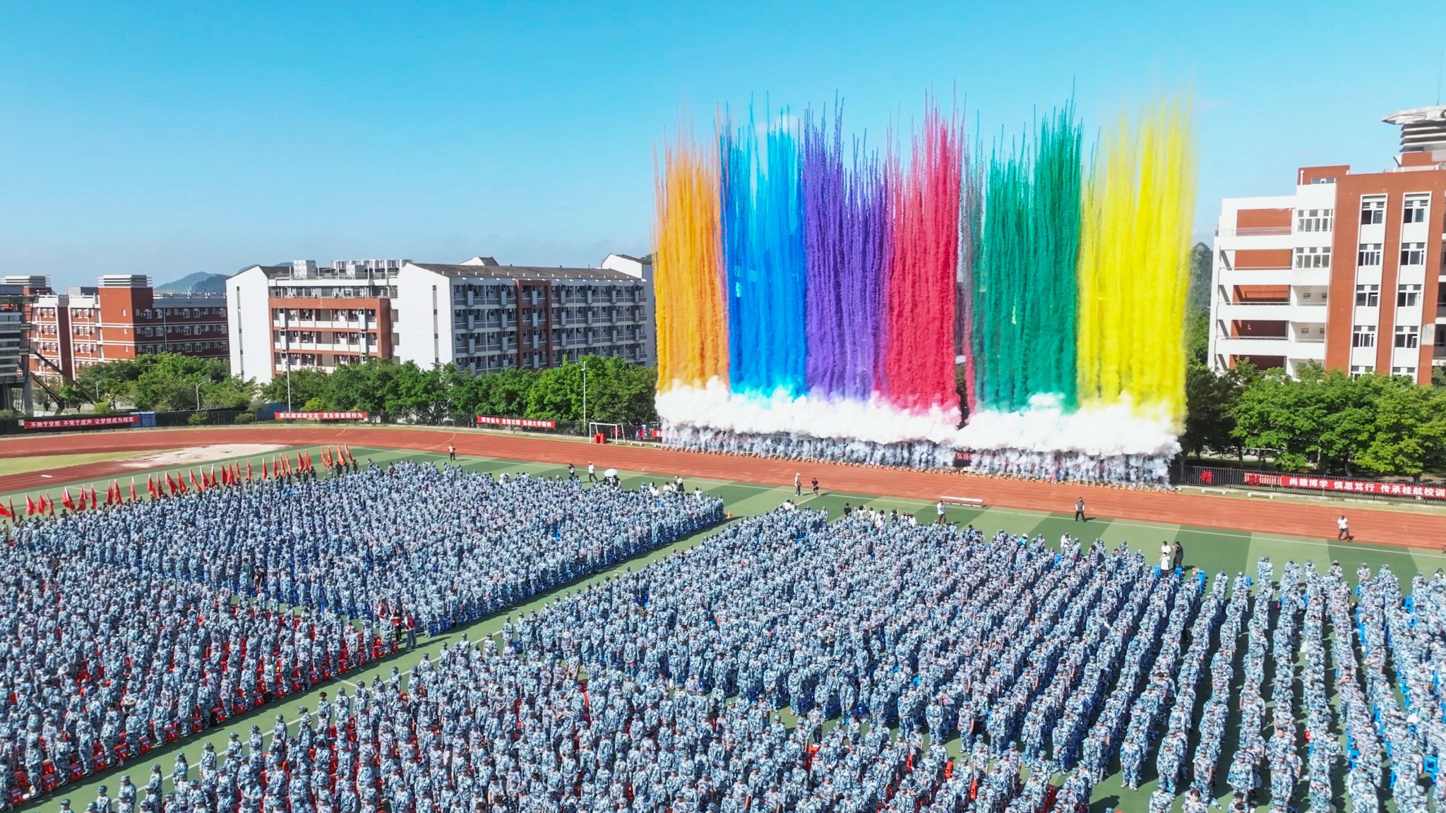 伴随着彩色礼炮冲向蓝天,典礼在校歌声中圆满结束。