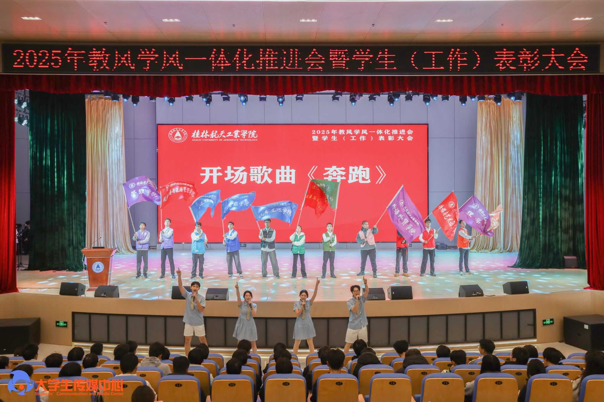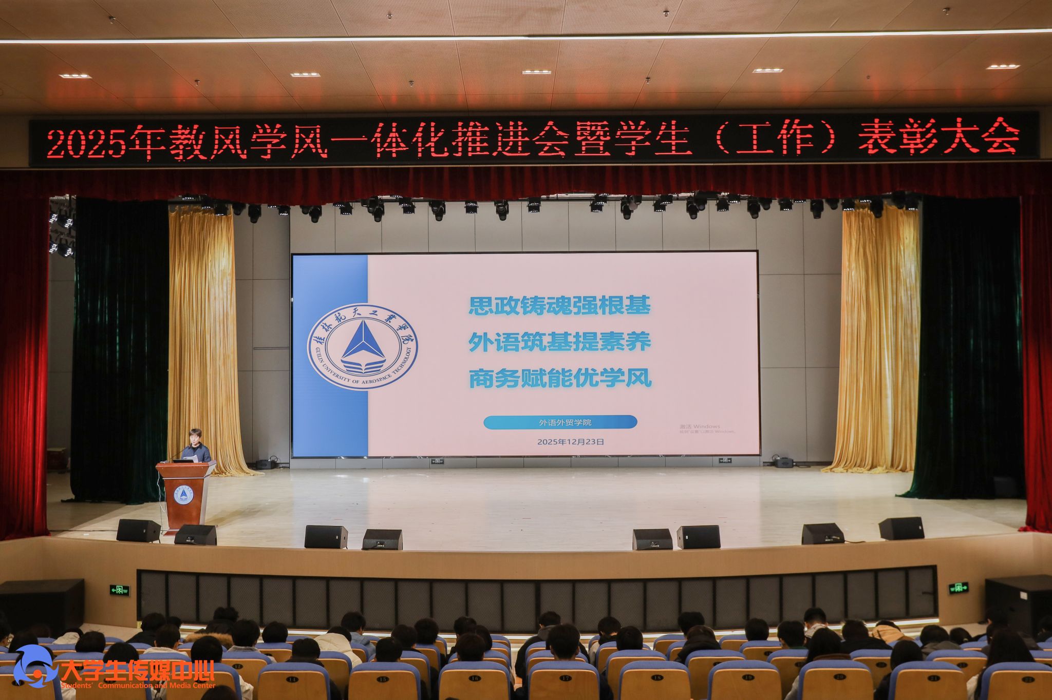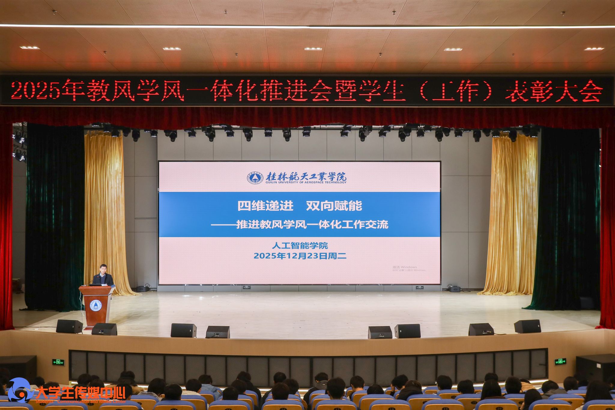 12月23日下午,学校在问天楼图书馆报告厅举行“星辰耀桂航·领航启新章”2025年教风学风一体化推进会暨学生(工作)表彰大会。学校党委书记韩峻峰,党委副书记、校长吴尽昭,党委副书记孙山林出席大会。桂林爱尔眼科医院党支部书记段绪艳、学校党校办、组织部、宣传部、学工部(处)、教务处、校团委等职能部门负责人,各学院党政负责人、专业负责人、教研室主任、辅导员、班主任及获奖学生、在校学生代表共同参加了会议。