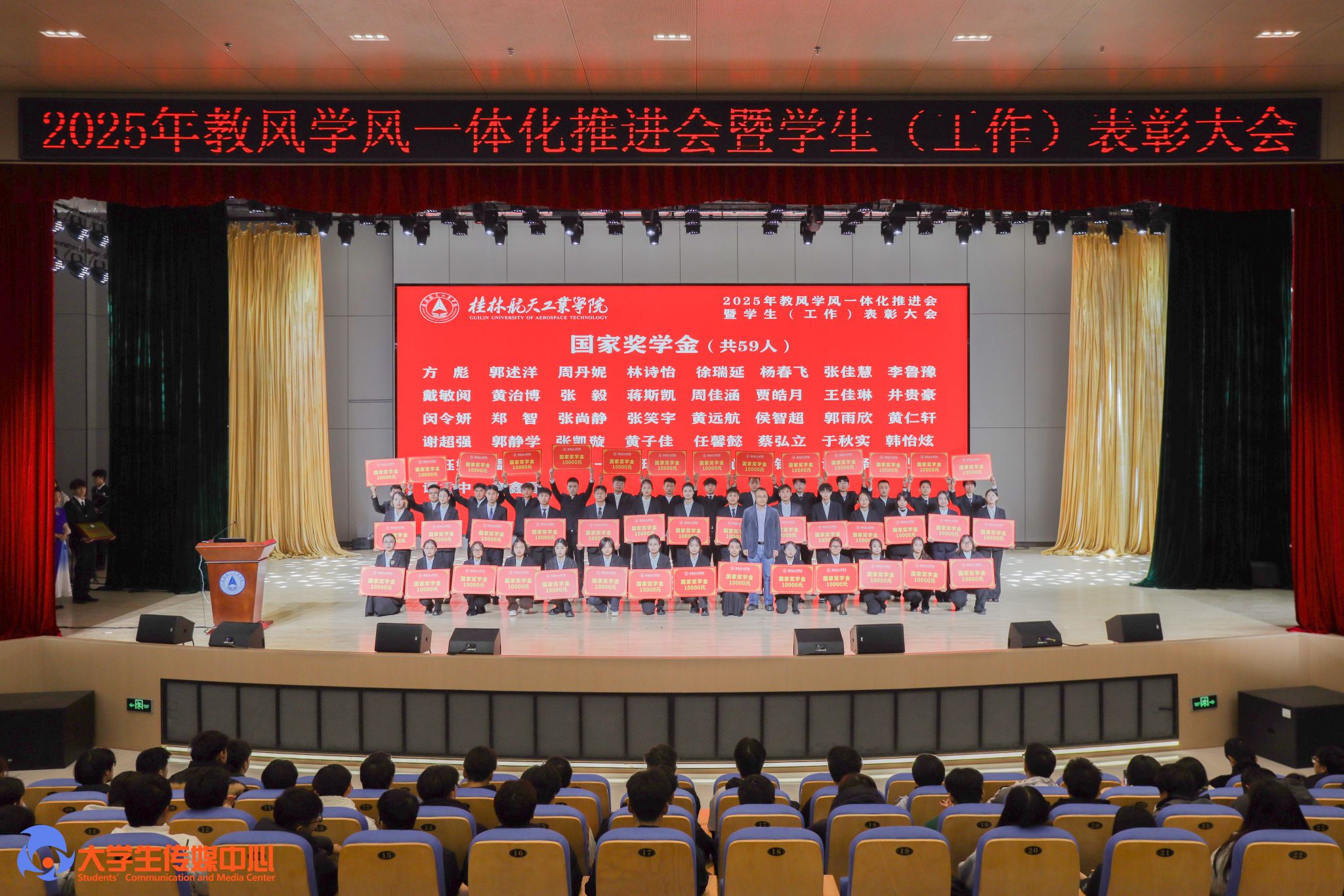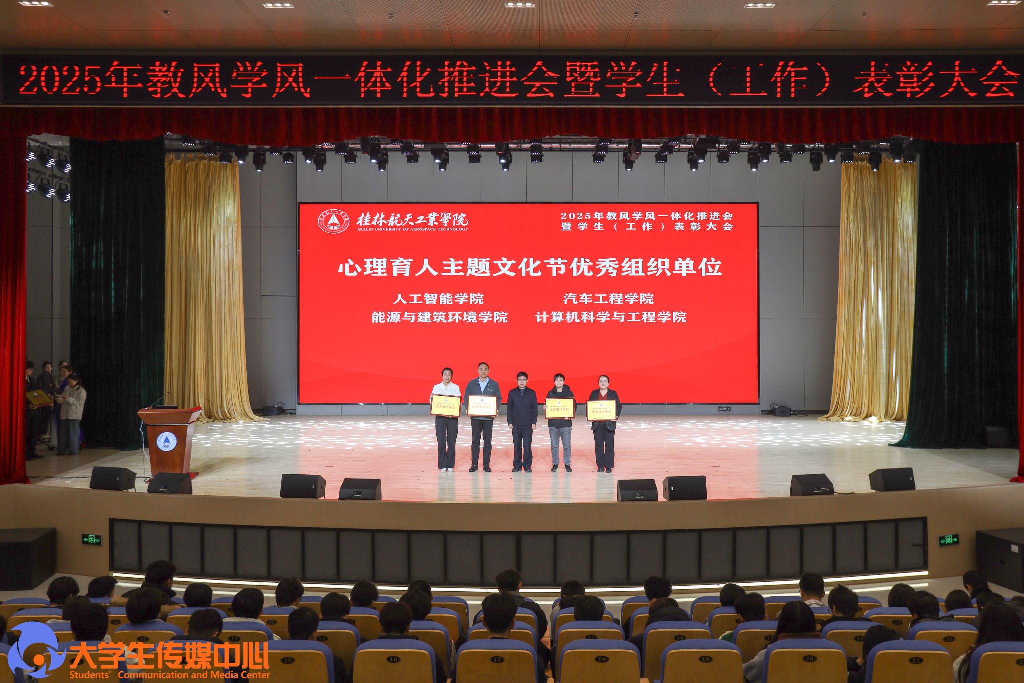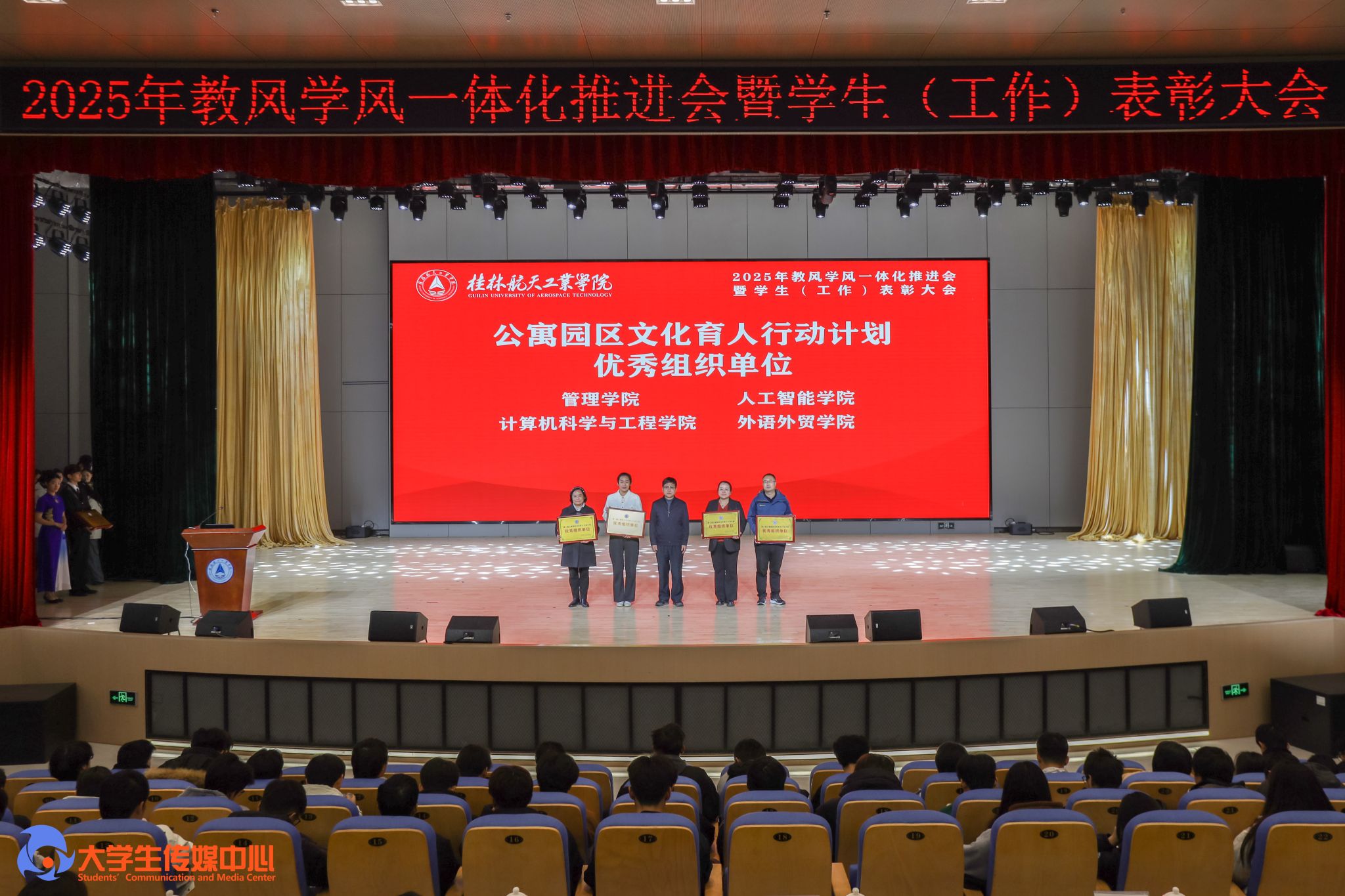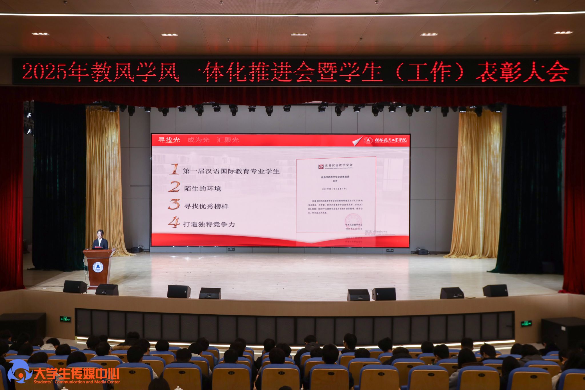 12月23日下午,学校在问天楼图书馆报告厅举行“星辰耀桂航·领航启新章”2025年教风学风一体化推进会暨学生(工作)表彰大会。学校党委书记韩峻峰,党委副书记、校长吴尽昭,党委副书记孙山林出席大会。桂林爱尔眼科医院党支部书记段绪艳、学校党校办、组织部、宣传部、学工部(处)、教务处、校团委等职能部门负责人,各学院党政负责人、专业负责人、教研室主任、辅导员、班主任及获奖学生、在校学生代表共同参加了会议。
