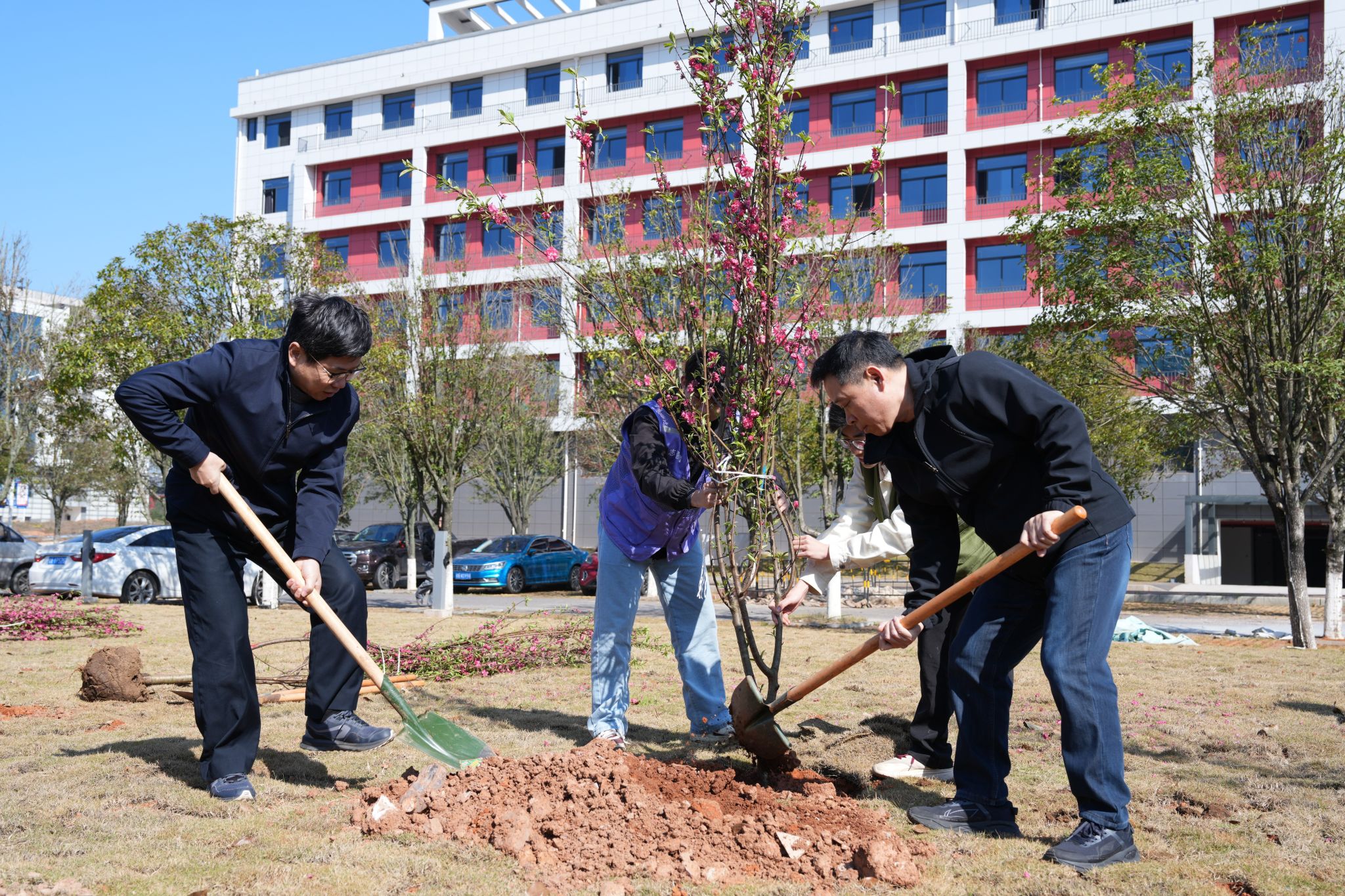 活动现场,全校师生精神饱满、干劲十足。大家分工协作、密切配合,每一道工序都有条不紊,呈现出一派热火朝天、欢声笑语的劳动景象。一棵棵新栽苗木迎风挺立,在春日的校园里舒展枝丫,为校园增添了勃勃生机。