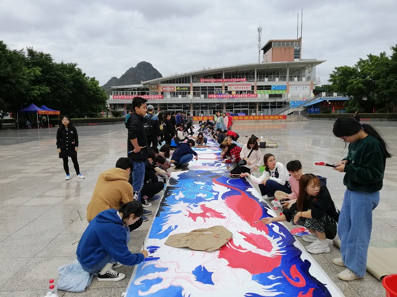 青春广场上,传媒与艺术设计学院96名师生在长达40米的画布上进行了主题为“薪火相传 筑梦蓝天”的现场即时绘画活动,现场绘画时长4个多小时,引来了众多校友和师生观赏。40米长卷上,一笔一画描绘出桂航师生对桂航未来发展的追求和对蓝天的热爱与向往。从盘古开天辟地到天宫一号翱翔宇宙,从观星台浑天仪到宇宙飞船射电望远镜,从嫦娥奔月到航天英雄杨利伟返航,历史与现代交融,每一幅画都饱含着桂航师生、校友对国家对桂航浓浓的深情与热爱。