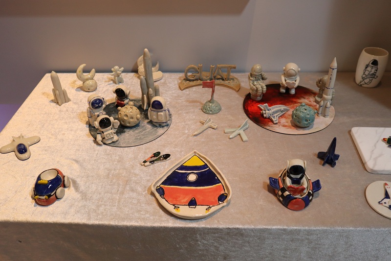 《“嬗变”——泥塑课程作品展》,共展出视觉传达设计专业2017级4、5班学生优秀作品100余件,是泥塑课程开课以来首次作品展。通过本学期泥塑课程的学习,学生首次完成了从泥到瓷的烧制;学生创作积极性高,主动利用课余时间完成上釉、装窑烧窑等环节,烧制出了一百余件作品;作品类型包括茶具、餐具、咖啡具、花器,耳饰及文房用品等;作品成型工艺涵盖了泥条盘筑、泥片成型、拉坯成型及注浆成型等工艺。作品主题融入航天文化和区域文化传承创新设计,取得了较好的教学效果。各类作品集实用性、艺术性及观赏性于一体,各具特色,展现了视觉传达设计专业学生的艺术素养和活跃思维。