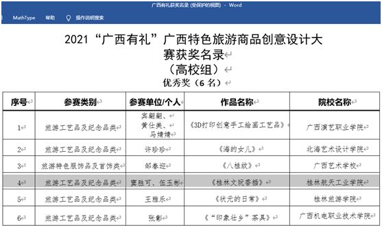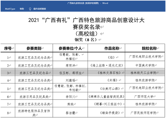 传媒与艺术设计学院近年来以区域文化与航天文化传承与创新设计为学院发展方向,近年来与桂林观志窑共建陶瓷艺术工作室,已在旅游文创产品设计方面取得较大影响,今年8月15日,该院选送的陶瓷作品在广西壮族自治区文化和旅游厅主办,广西旅游商品行业协会承办的2021“广西有礼”广西特色旅游商品创意设计大赛中,也分别获得高校组铜奖、优秀奖各1项。