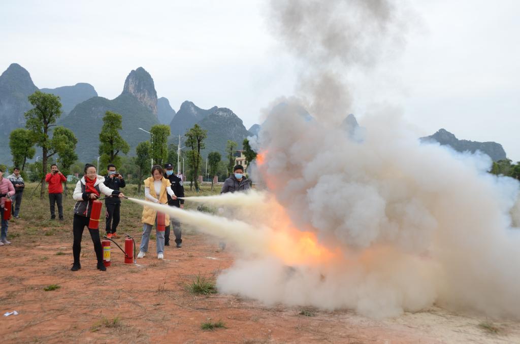 广西消防安全中心讲师农二凡向参训人员讲解火灾现场受伤简易急救法、火灾的扑灭方式以及水基灭火器和干粉灭火器的实际操作方法,保卫处校卫队员配合讲解进行了消防器材的实际操作演示。随后,参训人员严格按照“一摇、二拔、三压”的操作要领,分组体验了使用干粉灭火器现场灭火。
