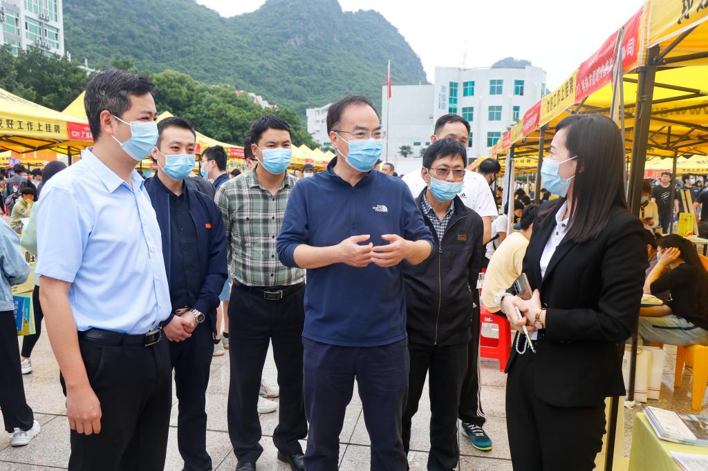 5月21日上午9:30,由共青团中央青年发展部、共青团广西区委、广西学联主办,best365手机版官方网站承办、桂聘人才网协办的2022年“广西青年爱广西”暨“千校万岗”广西大中专学生就业精准帮扶行动线下招聘会在学校青春广场举行。桂林市团委副书记刘俊,校党委副书记刘迎春亲临现场指导,学工部(处)、校团委负责人以及各学院党委副书记、团委书记、毕业班辅导员深入活动现场与用人单位深入交流,提供招聘服务。