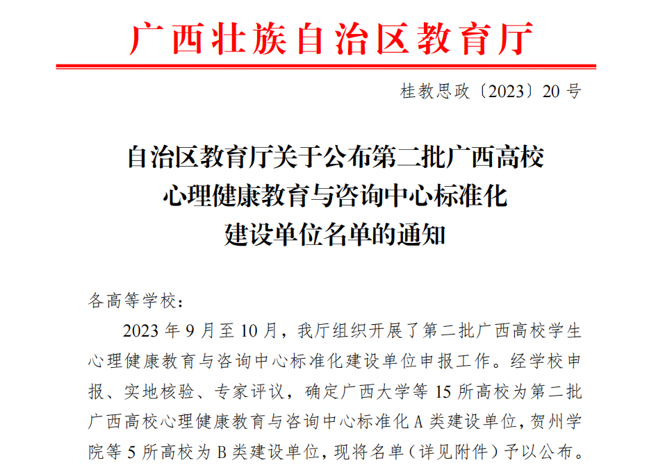 近日,自治区教育厅公布了第二批全区高校心理健康教育与咨询中心标准化建设单位名单,本次评定全区高校中15所A类和5所B类单位建设。best365官网被评为第二批全区高校心理健康教育与咨询中心标准化A类建设单位。