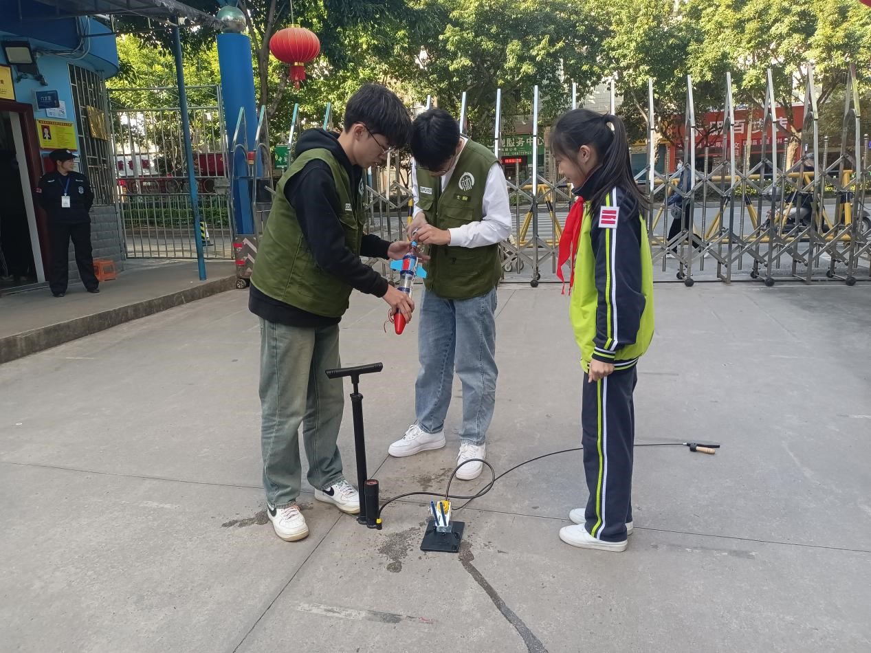 随后,学生们动手制作小型水火箭并成功进行试飞。在这一过程中,学生们不仅练习了动手能力和创新思维,还锻炼了沟通与协作能力。一场紧张而刺激的水火箭比赛不仅拉近了彼此之间的距离,也使学生们在亲身实践中感受到科学的魅力,并在有趣的氛围中理解科学知识。