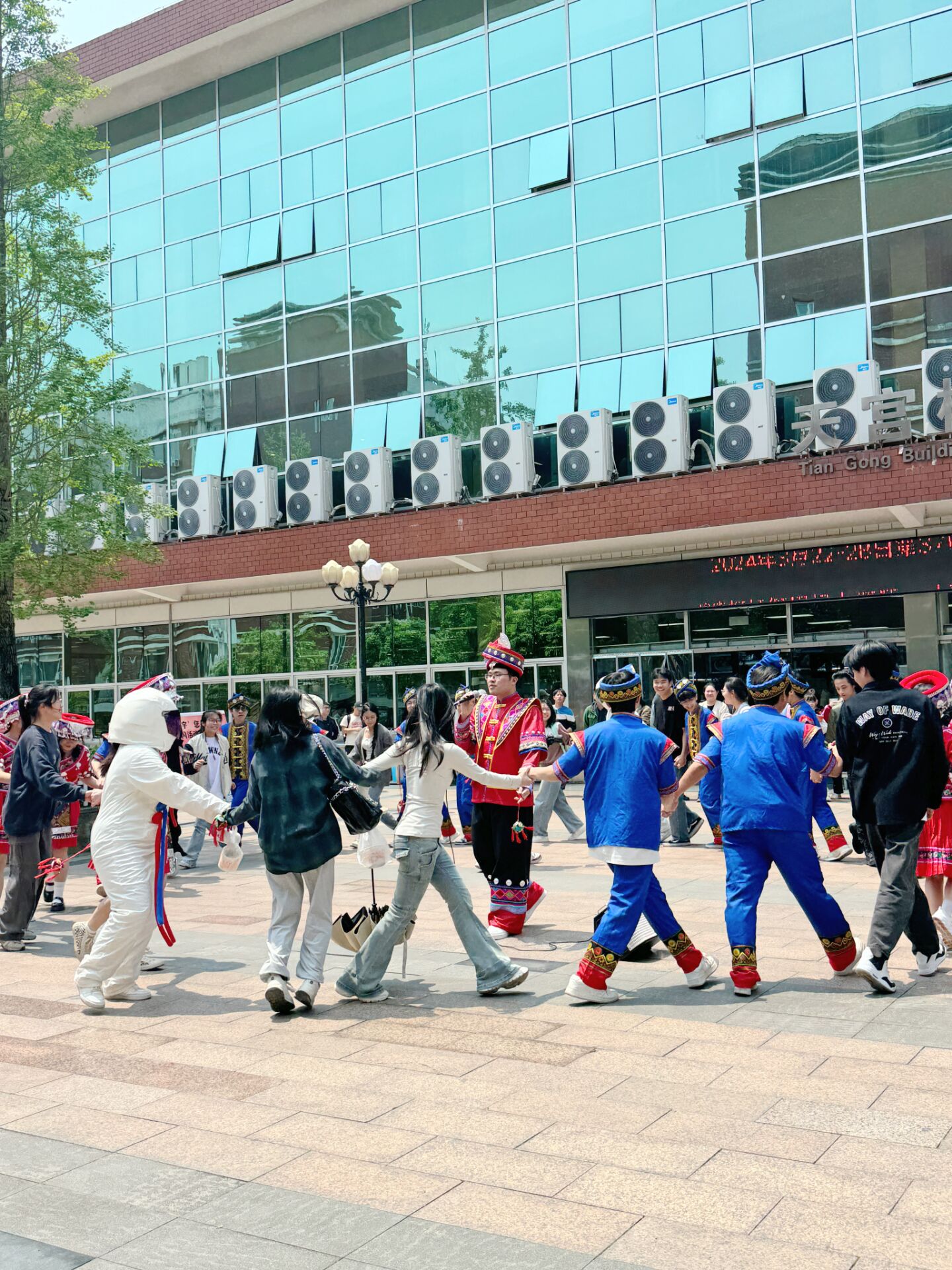 当《上春山》的音乐响起,现场气氛热烈,驻足观看的师生也备受感染,一起加入到联欢舞的队伍中,大家拍着手、唱着歌,随着欢快的节奏跳出了幸福的舞步,最后随着表演的学生抛出绣球和糖果,活动在一片欢声笑语中被推向高潮。