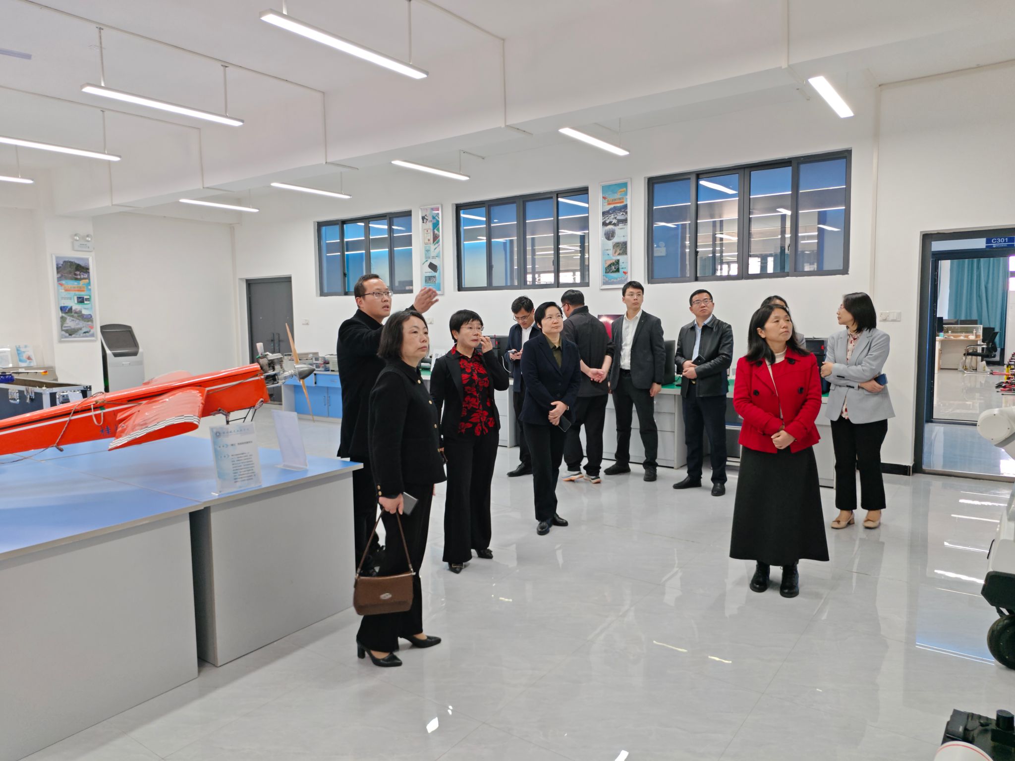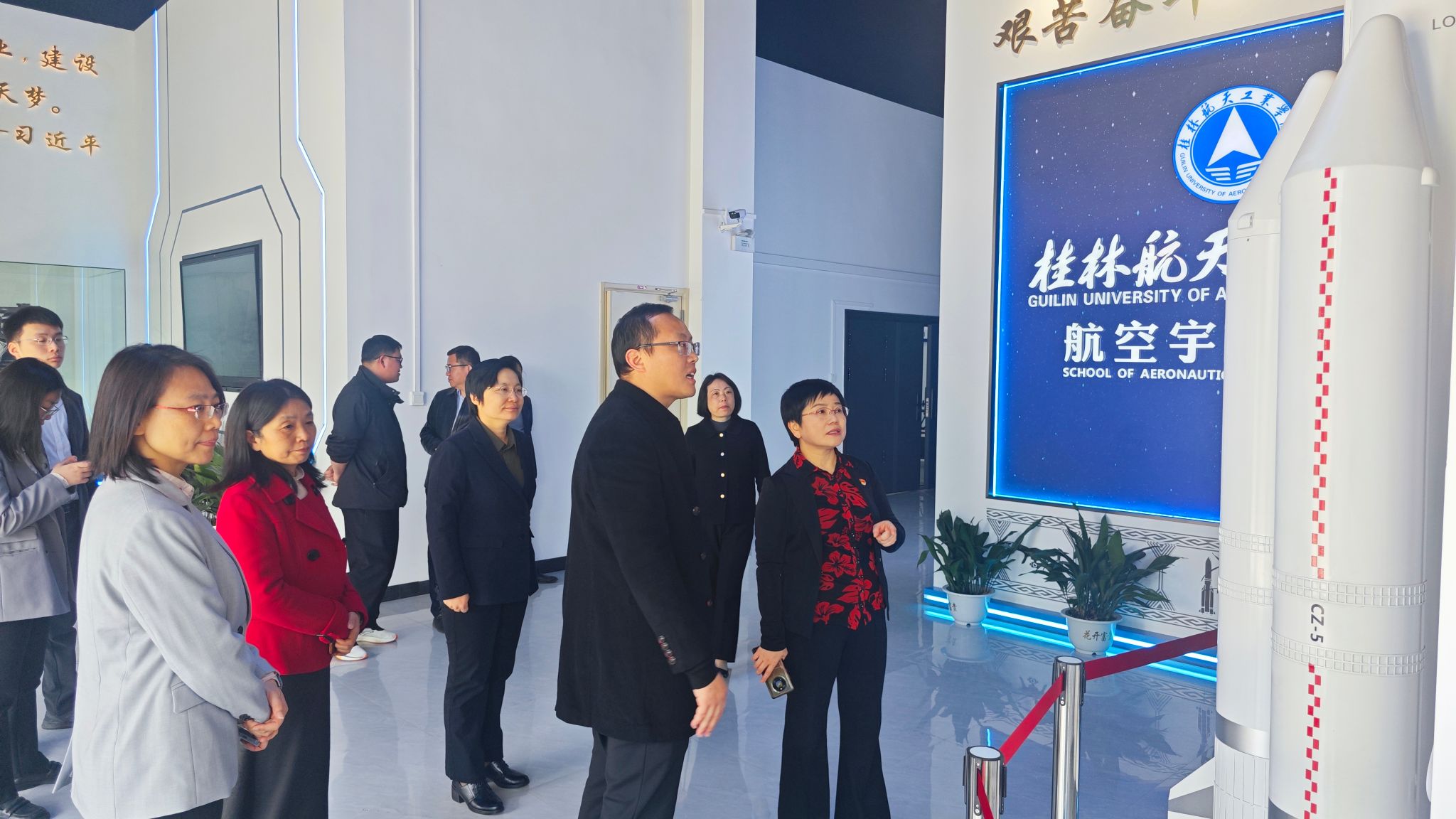 在葛莉副校长的陪同下,殷琼书记一行先后参观了校史馆、航天博物馆、航天品质中心、航空航天工程实验教学中心、广西小型无人机系统及应用工程研究中心、广西无人机技术应用院士工作站等特色平台。每到一处,到访成员都认真听取讲解,深入了解学校在航天特色学科建设、科研创新及人才培养方面的成果。殷琼书记对学校“航天+”特色发展模式给予高度评价,认为学校与湾沚区航空产业布局高度契合,为双方深化合作奠定了坚实基础。