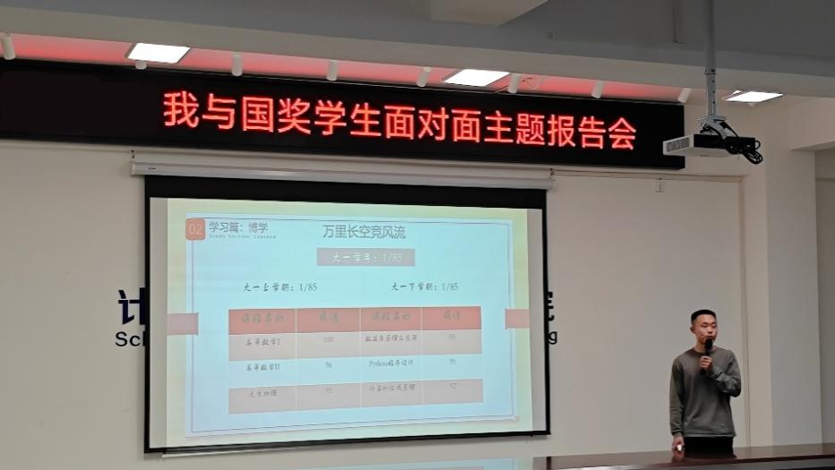我与国奖面对面活动中,国家奖学金获奖代表们依次上台分享经验。于秋实分享了“总结和归纳”的学习方法,结合自身实际,讲解了学科竞赛对知识掌握和思维激发的作用;韦子鸿论述出了理论实践结合的重要性,建议同学们注重专注力的提升。江鸿银介绍国家励志奖学金的评选要求,并分享了“发现规律—验证规律—利用规律”的学习方法。提问环节中,同学们积极互动,国家奖学金获奖代表们耐心解答同学们的问题,提供了贴合实际,高效实用的建议。