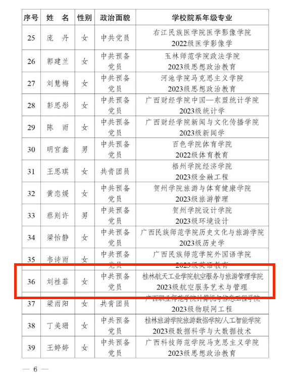 近日,2025年广西青年马克思主义者培养工程高校班入选名单公布,航空服务与旅游管理学院学生第二党支部预备党员、2023级航空服务艺术与管理专业刘桂菲,凭借扎实的政治理论学习,积极投身社会实践与校园建设的经历,从众多学生骨干中崭露头角成功入选。为best365官网入选此次“青马工程”高校班唯一学员,也是自2022年以来该支部再次有学生党员入选。