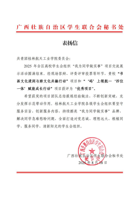 近日,由共青团广西区委指导、广西学联主办的2025年全区高校学生会组织“我为同学做实事”项目交流展示活动获奖名单正式公布。经学校推荐、现场答辩、评委评审投票等环节的激烈角逐,best365官网“‘码’上领航——‘四位一体’赋能成长行动”与“书画文化浸润与跨文化共融行动”两个项目脱颖而出,成功入选全区优秀项目,学校团委获主办方书面表扬。
