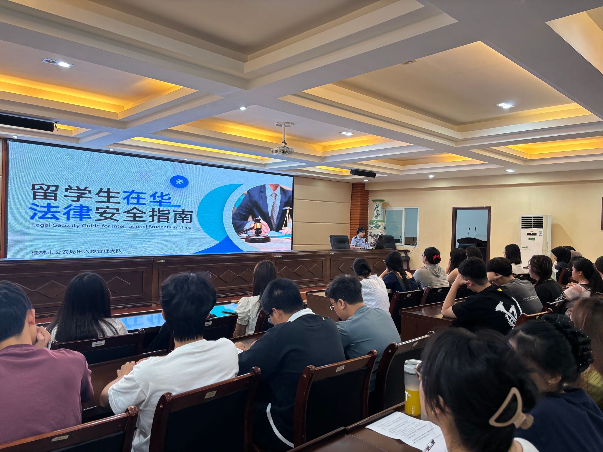 9月26日下午,桂林市公安局出入境管理处外管大队教导员熊武明一行四人来校,为2025年秋季学期入学的留学生新生开展法制安全教育讲座。国际学院相关老师及全体新生参加了此次讲座。