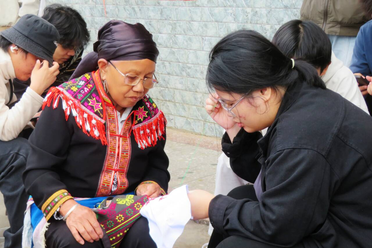 在邓正姣非遗传承室,师生们亲身体验瑶族国家级非遗“反面绣”技艺。传承人邓正姣现场演示“以针为笔、以线为墨”的独特绣法——从背面起针,正面成画,图案对称工整、色彩鲜艳饱满。学生们在邓正姣老师和其他5位老师的指导下尝试绣制反面绣,感受非遗文化的深厚底蕴。传媒与艺术设计学院带队教师表示:“非遗是民族的根脉,通过体验式学习,学生们不仅掌握了技艺,更深刻理解了‘各民族共同团结奋斗、共同繁荣发展’的内涵。”学生们也在体验后表示:“非遗文化是民族的根脉,我们要做文化的传承者,更要当民族团结的践行者。”