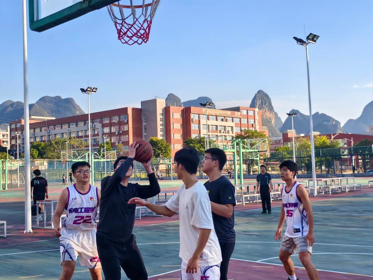 随着一声哨响,由教师党支部与学生党支部代表组成的混合战队与学院新生篮球队展开激烈角逐。教师队员们以精准的战术配合展现党员的沉稳作风,学生队员则以灵活的突破和默契的协作彰显青春活力。学院党委书记杨华、院长韩兴国等领导主动加入教师战队,以“党员先锋”的身份冲锋在前,既以身作则展现健康生活理念,又通过赛中战术指导与队员并肩作战,充分彰显党建活动的示范引领作用。