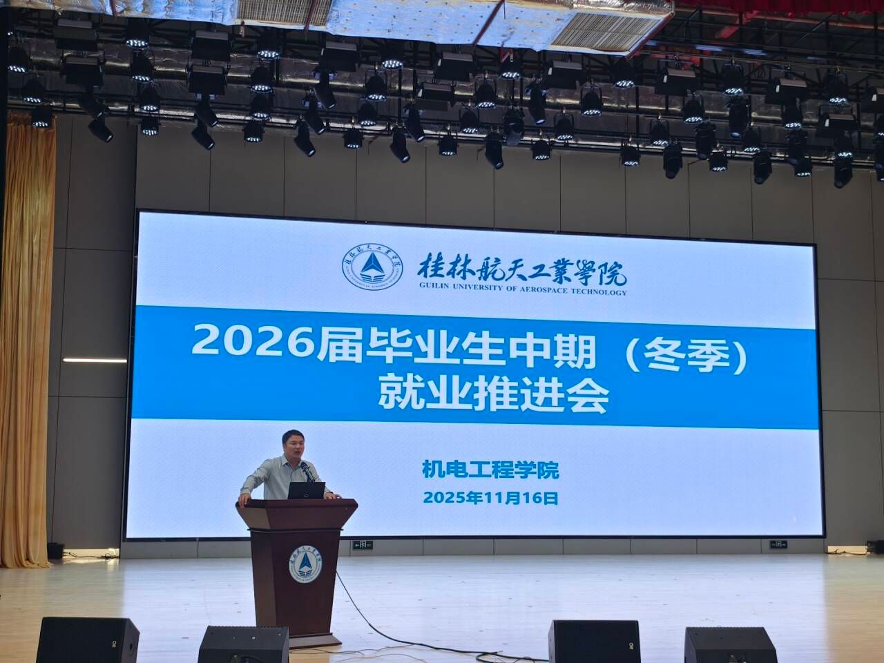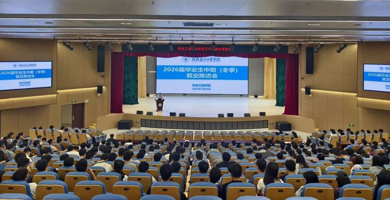 为破解2026届毕业生就业瓶颈,提振学生信心,同时强化安全意识,11月16日,机电工程学院在问天楼大报告厅召开“2026届毕业生中期就业推进会暨毕业生安全教育主题班会”。学院党委书记杨华、党委副书记陆宇川、全体毕业班辅导员及2026届全体毕业生参会。会议聚焦就业形势分析、职业规划指导及安全风险防范,为毕业生提供全方位支持与指引。