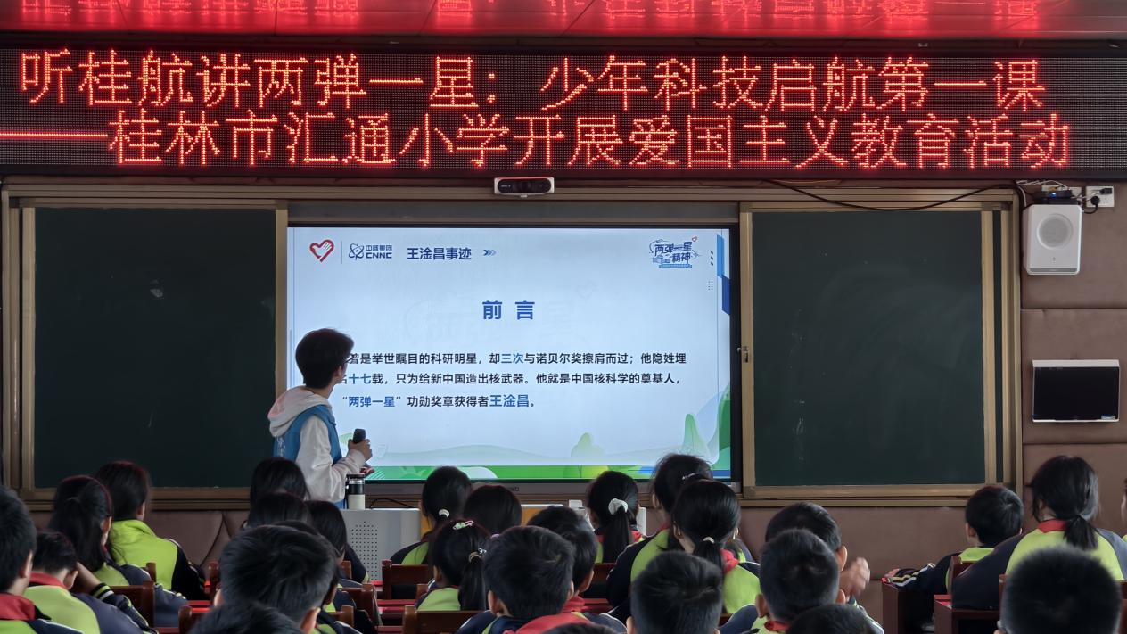 针对中小学生认知特点,服务队走进桂林市汇通小学和社山桥社区,打造沉浸式科普课堂。在汇通小学,讲解员化身“时光向导”,借助《那年那兔那些事》动画片段,将核研制历程拆解为“秘密任务”“戈壁奋战”“东方巨响”等故事节点,配合问答互动,激发学生兴趣;在社山桥社区,队员们通过科学家事迹分享、集体朗诵《致未来的科学家》等形式,引导中学生树立科技报国志向。