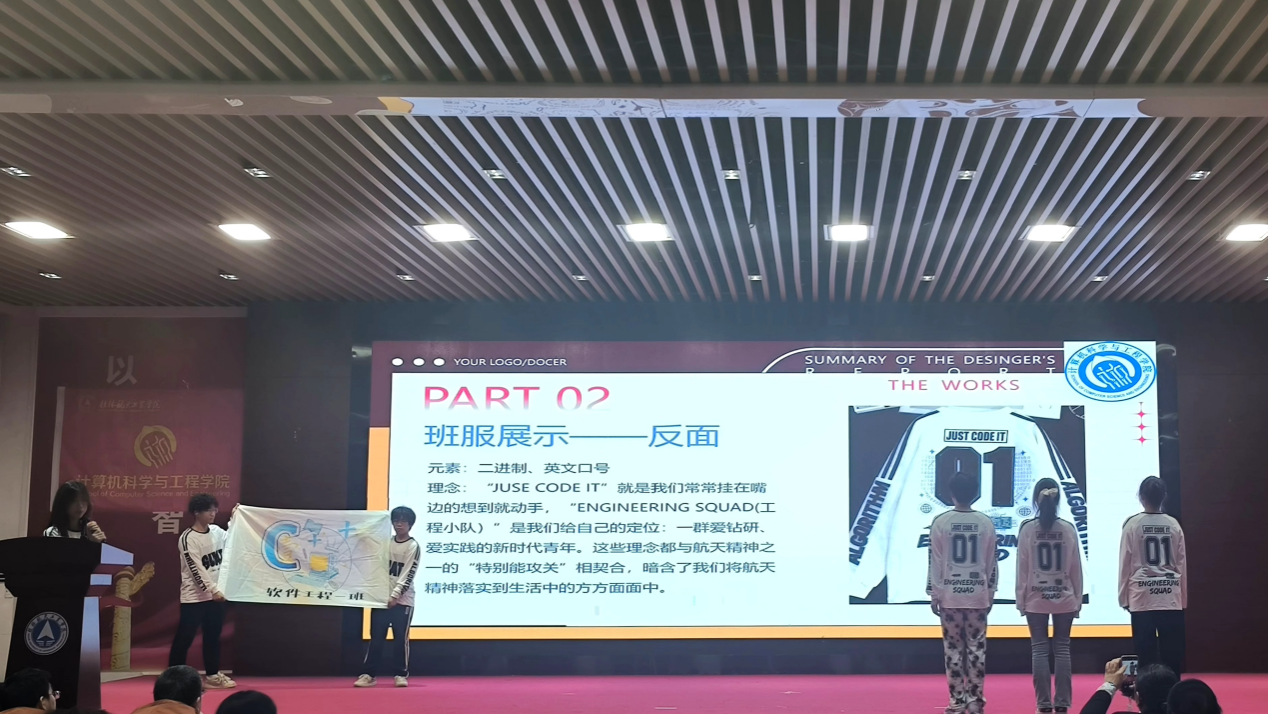 比赛现场气氛热烈,各班级依次登台,展示精心设计的班服与班旗,并阐述创作理念。作品巧妙融合航天院校的文化基因与计算机专业的特色元素——如代码符号、逻辑结构、二进制图案等,既彰显专业底蕴,又展现青春创意,风格多元、内涵丰富。评审团从文化内涵、创意设计及现场展示效果等多个维度进行综合评分。最终,2025级软件工程2班凭借出色的设计作品荣获大赛一等奖。
