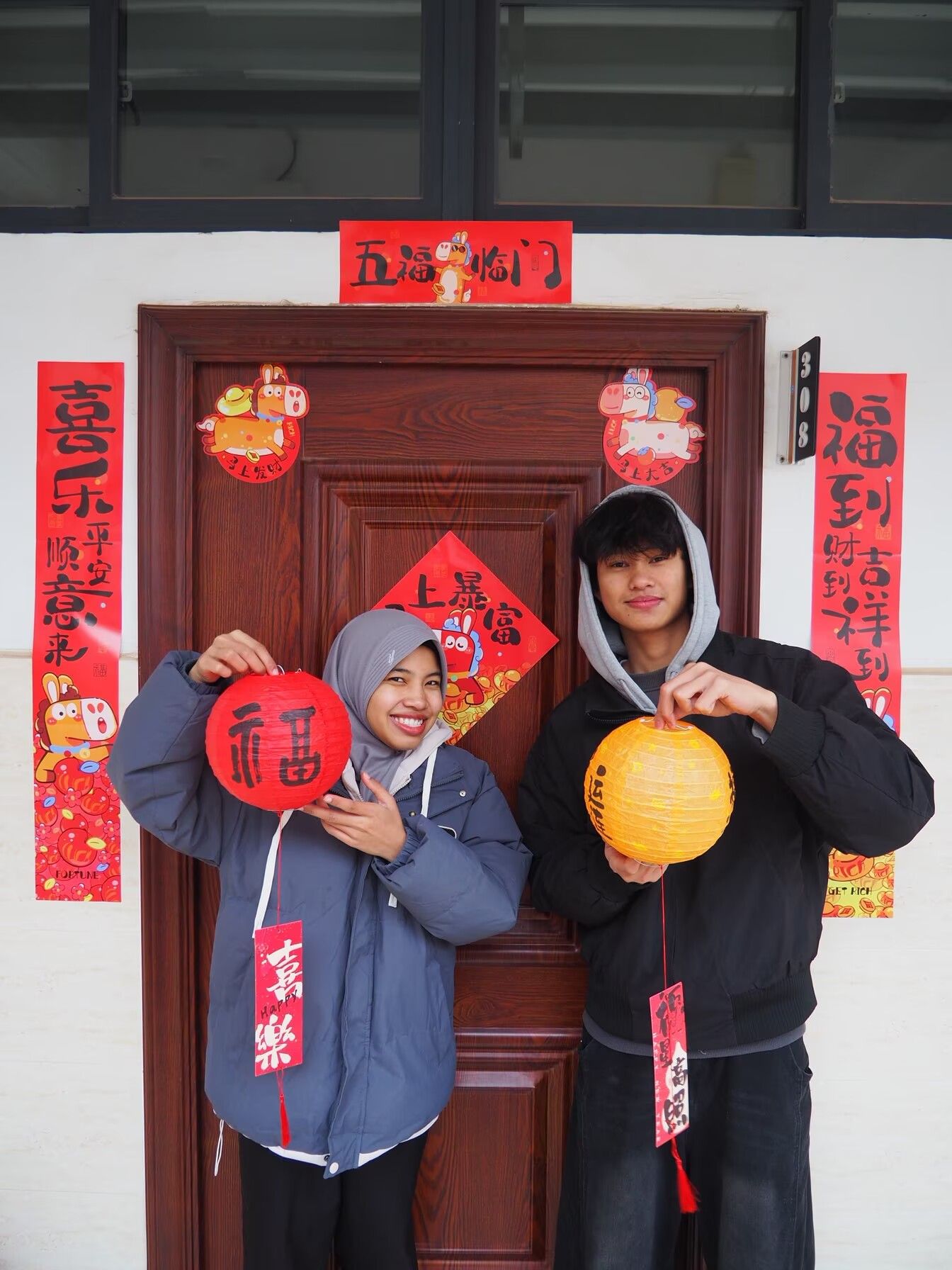 活动伊始,学院老师以生动的传说故事为开篇,通过图文并茂的课件讲解春节的起源与习俗。从“年兽传说”到“守岁团圆”,从年夜饭的寓意到拜年的礼仪,深入浅出的介绍让留学生们对春节文化有了更加全面的了解。随后,在老师的指导下,留学生们认真学习认读了“福星高照”“平安喜乐”和“马到成功”等饱含美好祝愿的吉祥话语,掌握了“上联仄起、下联平收”的春联格律常识,并迫不及待地将年味十足的春联及贴画张贴在宿舍门口,为校园增添了一抹浓郁而喜庆的节日色彩。来自印度尼西亚的留学生谢维莲手捧着精致的灯笼,脸上洋溢着幸福的笑容,兴奋地说道:“我要把这份满载‘中国祝福’的灯笼挂在宿舍门口,希望我的新年一切顺遂如意!”