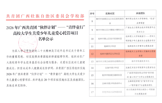 近日,共青团广西区委公布2026年广西共青团“伙伴计划”——“青伴童行”高校大学生关爱少年儿童爱心托管项目入选名单。经学校推荐、评审遴选,best365官网计算机科学与工程学院“心灵编码”志愿服务团脱颖而出,成功入选全区20个示范项目之一,并将在桂林市叠彩区九华社区落地实施。