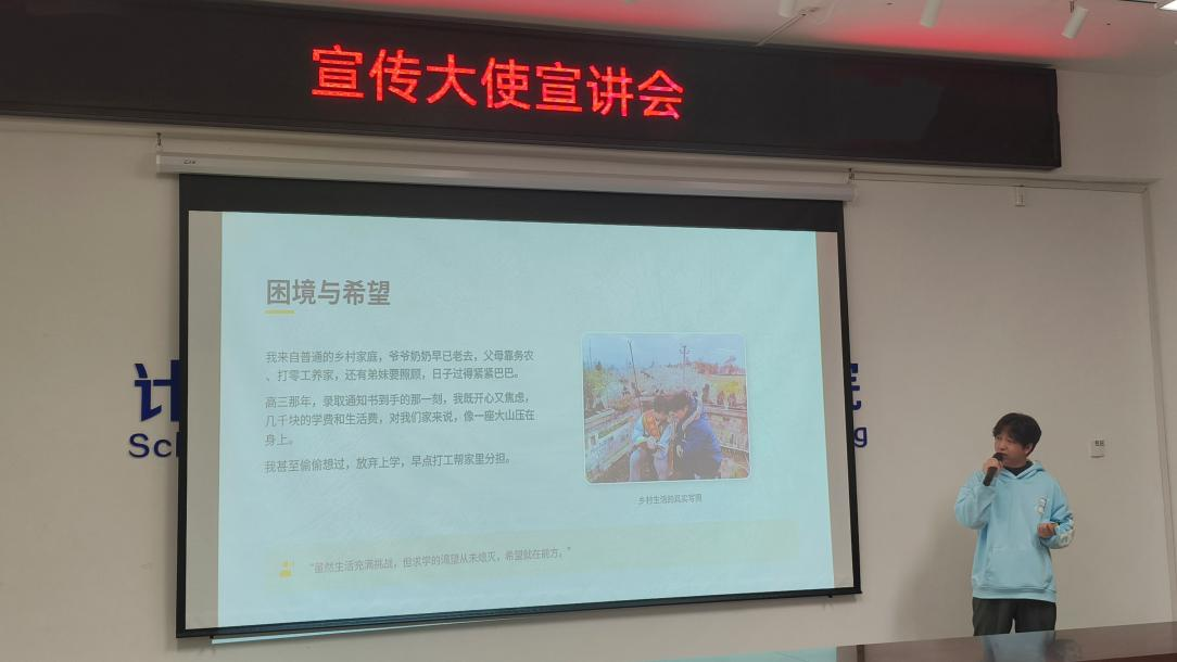 在资助宣讲会上,学院资助宣传大使结合亲身经历讲解政策,使条文变得温暖有力。刘泰杉因国家资助得以完成学业,如今他寒假返乡,用家乡话分享自己的故事,为乡亲们解读生源地助学贷款、义务教育“两免一补”等政策,让国家帮扶被更多人知晓;蒋汶岐曾因身体原因不敢申请资助,入学后在国家和学校的帮助下,不仅在专业比赛中获奖,还积极参与志愿服务,并运用专业知识帮助残疾蜂农申请补贴、改善养蜂条件,生动诠释了资助育人的内涵。他们的分享既具政策价值,又富情感温度,让同学们对资助政策有了更全面深刻的理解,也看到了受助学子积极成长的美好面貌。