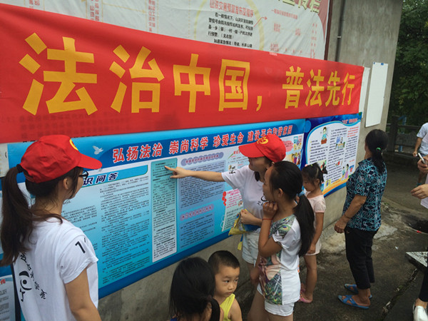 “法治中国,普法先行”社会实践活动根据“六五”普法规划任务及普法办要求,通过宣传海报、专题讲座、模拟法庭、手抄报展、漫画展、做游戏、有奖问答、案例展示等多样化的参与式体验活动。实践团成员按照受众对象不同主要分三大板块展开。一是针对乡村中小学生开展的以增强青少年的法律意识,培养他们知法、懂法、守法、用法的能力,预防和减少青少年犯罪为主要目标的青少年法制教育宣传。二是针对在校大学生围绕校园安全、学生就业和节能减排等主题开展校园法治宣传。三是走进桂林、贵港两地周边乡村以“弘扬法治,崇尚科学,珍爱生命,建设平安和谐家园”为主题的反邪教、离毒品、防诈骗、爱生命等方面的知识。