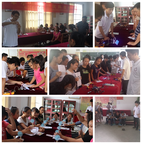 同时,由自动化应用协会骨干组成的科技交流小组,还来到了桂林灵川县灵田镇灵田初中,和一群对科技有着浓厚兴趣的初三同学们开展了一场别开生面的科技小发明的交流互动活动。项目组成员首先把事先制作好的科技宣传单发到每一个同学手中,接着把自己精心制作的科技小发明放在展台上供大家参观,有智能wifi小车、蓝牙小车、心型灯、RFID无线刷卡、点阵频谱、四旋翼飞行器等,同学们看得赞不绝口,在感受科技神奇魅力的同时,也跃跃欲试地自己亲手制作了小风扇、声控灯等科技小作品。