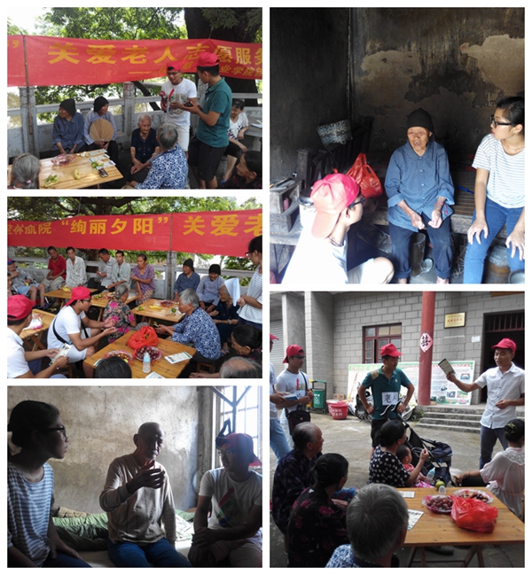 由来自不同专业不同年级的学生党员和学生干部,针对农村留守老人,开展关爱志愿服务工作。他们分别前往七星区老龄办、毛塘社区、养老服务中心展开调研,还特别组织前往朝阳乡上边村、山脚底村等地开展志愿服务工作。在了解了当地农村留守老人的切身生活状况之后,为老人们进行了安全防护知识讲解、有奖问答、养生知识宣传及安防小表演等,还专门前往两个孤寡老人家进行慰问,为他们带去了保健养生锤等生活必需品和一些时令水果,与老人心对心的交流,使他们感到社会的温暖。老人们对这群年轻大学生的到来感到特别高兴,尤其是一名老党员,笑着说:“现在的年轻人,很好地把我们国家尊老敬老的精神传承了下来,让我们的老年生活感受到关爱和幸福,这样的活动是值得肯定的。”