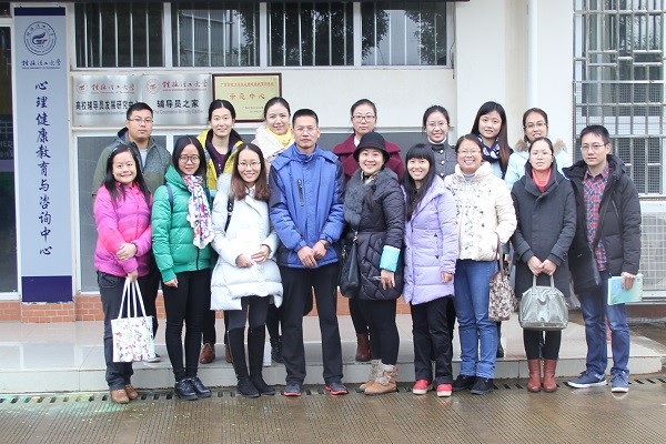 下午14时,刘莉湘君带领专兼职教师到桂林理工大学大学生心理健康教育基地(雁山校区)参观交流学习,受到了桂林理工大学学生工作处副处长冯广辉、心理咨询中心主任谭永梅的热情接待。冯广辉和谭永梅陪同和带领刘莉湘君一行13人参观了大学生心理健康教育与咨询中心各功能室和设施,并热情详细地对中心工作进行了详略得当的介绍与交流,并在最后合影留念。