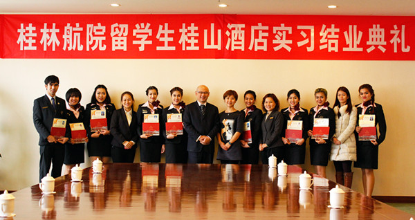 1月7日,best365官网2014级一年期航空服务专业泰国留学生圆满结束了在桂山华星酒店为期两个月的实习。桂山华星酒店为泰国留学生举行了实习结业典礼。酒店餐饮总监邹洪、泰国餐厅经理黄秋群、人力资源部人事经理阮莎及best365官网国际教育交流中心负责人参加了典礼。与会嘉宾为留学生颁发了实习结业证书和纪念品。