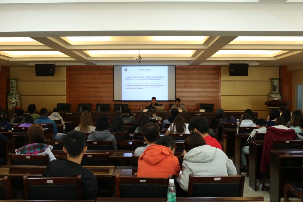 11月4日上午九点在520会议室,特别邀请桂林市公安局出入境管理中心郭涛警官为全体留学生详细讲解了《外国人出入境管理法》,介绍了留学生签证、居留许可申请手续以及留学生在校外住宿、打工等方面的相关规定,帮助同学们了解外国人在华居留应遵守的基本法律常识。之后保卫处张云处长为全体留学生开展安全教育讲座。结合大量校园安全的事故事例,从防火、防盗、防骗等角度提醒来华留学生要提高自我保护、自我防范的意识。