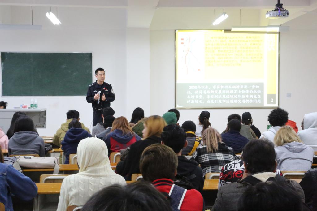11月7日下午四点,邀请桂林市公安局交警大队的王勇警官为全体留学生开展了交通法律法规讲座。王警官结合新交通法律法规条例,主要从常见交通违规现象、如何避免交通违规等方面依次展开,讲解了目前存在的交通安全隐患,强调了安全出行、文明出行的重要性。他以生动的事实和惨痛的教训警示大家注意交通安全,严格遵守交通法律法规,启示大家交通安全关乎生命。
