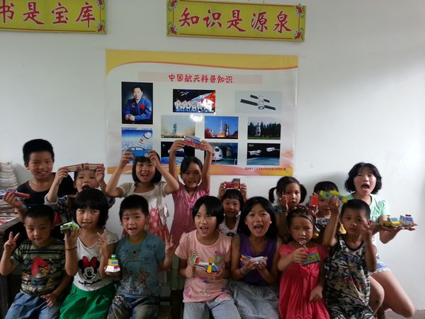 团队首先和孩子们以共同做手工的形式开展了初步认识,“你叫什么名字?”“几岁了?”“你的爱好是什么?”“长大后想当什么?”……从一问一答的几句话变成了滔滔不绝的谈心,大手与小手共同编织着对未来的憧憬。孩子们在哥哥姐姐的指导下,制作了喜爱的小动物、小玩具,一起琢磨着只能在电视上见到的飞机、火车、汽车模型,很快与小朋友们打成了一片,欢声笑语充满了整个小课堂。在窗外一旁的村民们也忍不住来到自己的孩子的身旁,一同做起了手工。一位村民感叹:“这是第一次陪孩子共同完成这样有趣的“小任务”,激动、高兴!”