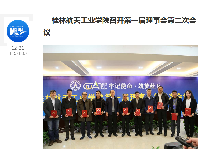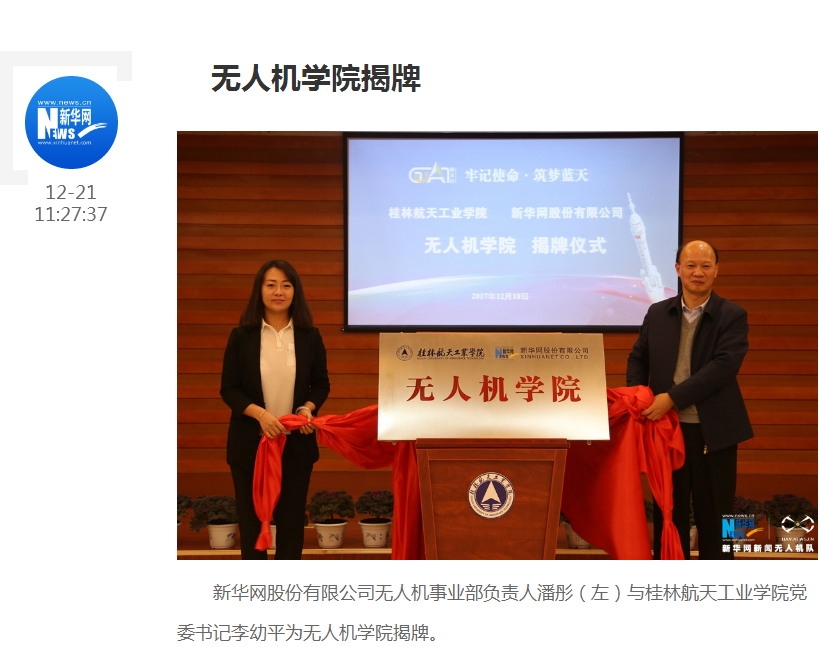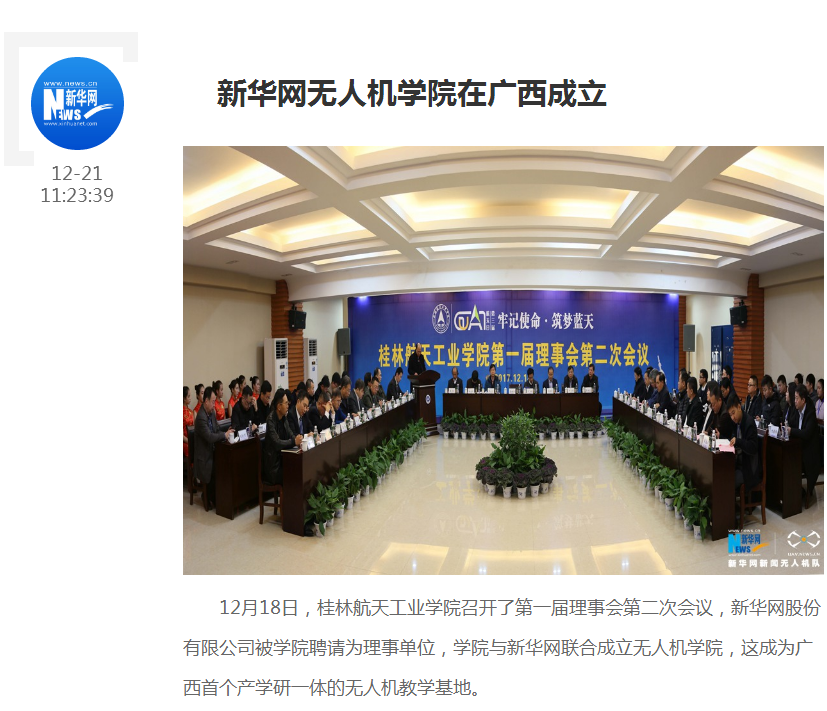 12月18日,广西best365手机版官方网站举办“牢记使命·筑梦蓝天”为主题的第三届“航天日”活动。当日上午best365手机版官方网站召开了第一届理事会第二次会议,新华网股份有限公司被学院聘请为理事单位,学院与新华网联合成立无人机学院,这成为广西首个产学研一体的无人机教学基地。