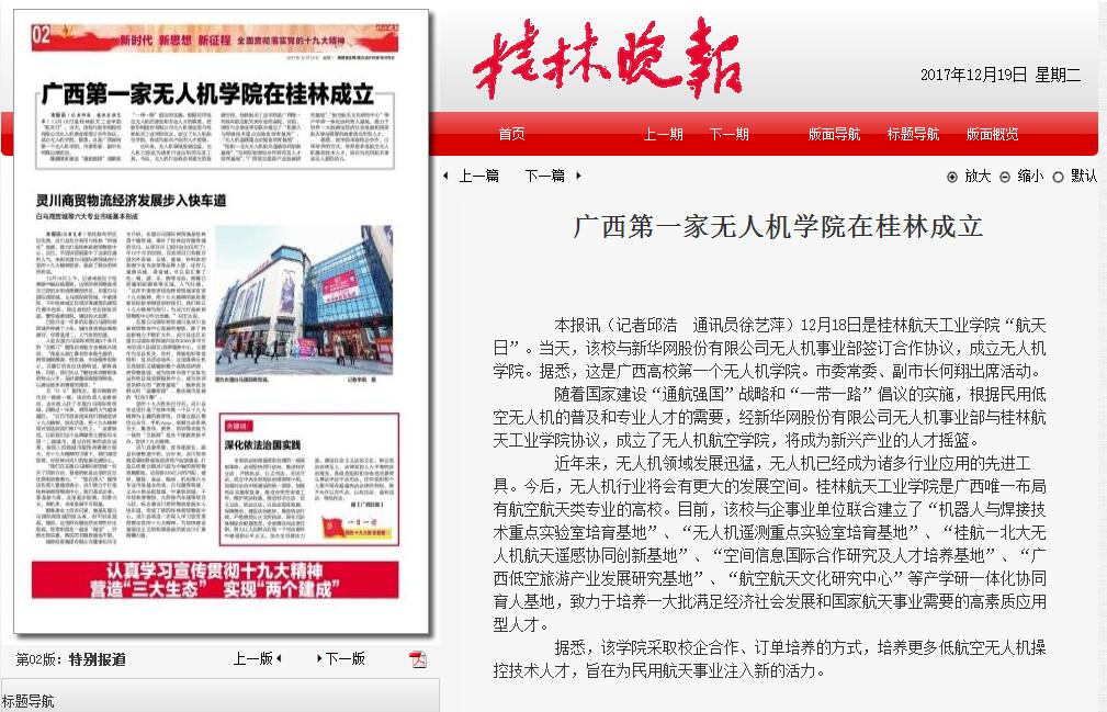 本报讯(记者邱浩 通讯员徐艺萍)12月18日是best365手机版官方网站“航天日”。当天,该校与新华网股份有限公司无人机事业部签订合作协议,成立无人机学院。据悉,这是广西高校第一个无人机学院。市委常委、副市长何翔出席活动。