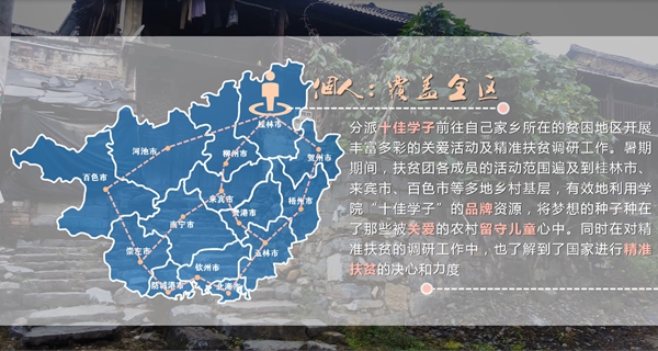 扶贫团以“(1+1)>1”(即“团队+个人”)发挥最大效用的活动理念,采用“集中-分散”的活动方式,暑期期间,扶贫团各成员的活动范围遍及到桂林市、来宾市、百色市等多地乡村基层,有效地利用学院“十佳学子”的品牌资源,将梦想的种子种在了那些被关爱的农村留守儿童心中。