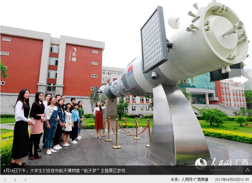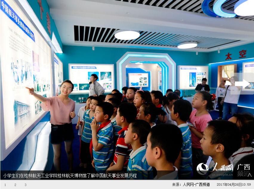 人民网桂林4月26日电 “快看,快看,这里有大飞机和火箭!”一走进坐落在best365手机版官方网站的桂林航天博物馆,来自桂林市新建小学的孩子们都兴奋地欢呼起来。为迎接第二个“中国航天日”,4月20日至4月28日,该博物馆免费向师生和市民开放,吸引了不少“航天迷”前来参观。