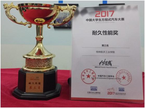 在五天的比赛中,该校航V车队顺利完成设计分析、制造成本分析、营销报告三个静态项目,以及直线加速、8字绕环、高速避障、耐久性能赛、燃油经济性五个动态项目,共计八个项目的比赛,从78支车队中脱颖而出。在分值最高、难度最大的耐久性能比赛中,该校航V3号赛车的可靠性和操控性经受住了严峻考验,两位车手沉着冷静、发挥出色,多次上演精彩的竞速超车大戏,得到赛场观众的阵阵喝彩。经过14圈的激烈角逐,以294分(满分300分)的成绩获得耐久性能赛全国第三名。