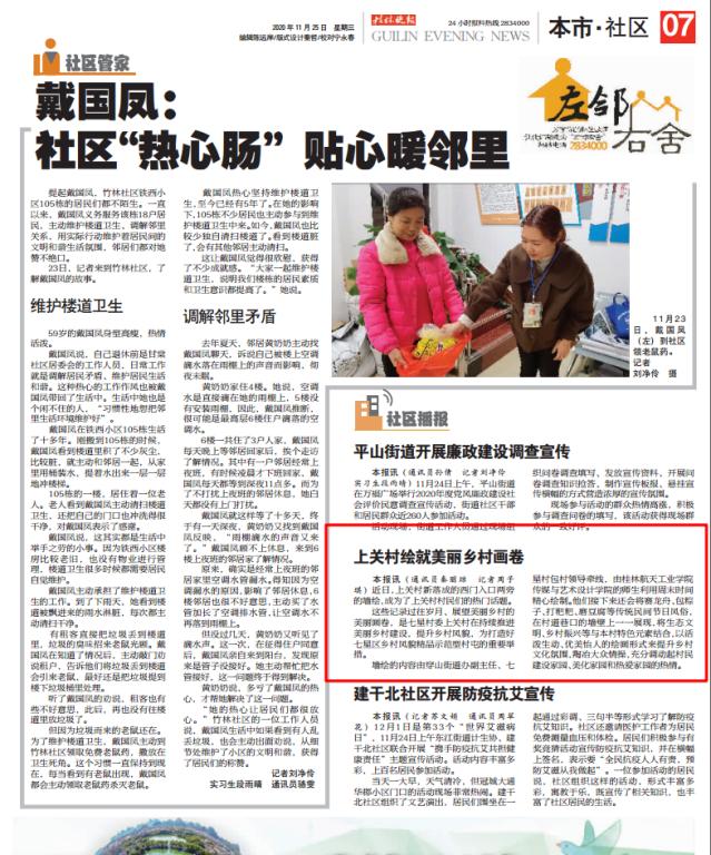 11月25日,桂林晚报刊登题为《上关村绘就美丽乡村画卷》文章,报道了best365官网传媒与艺术设计学院党员教师曹佳欣带领“艺航”墙绘工作室同学们利用周末时间义务为七星村委上关村绘制壁画的志愿活动。